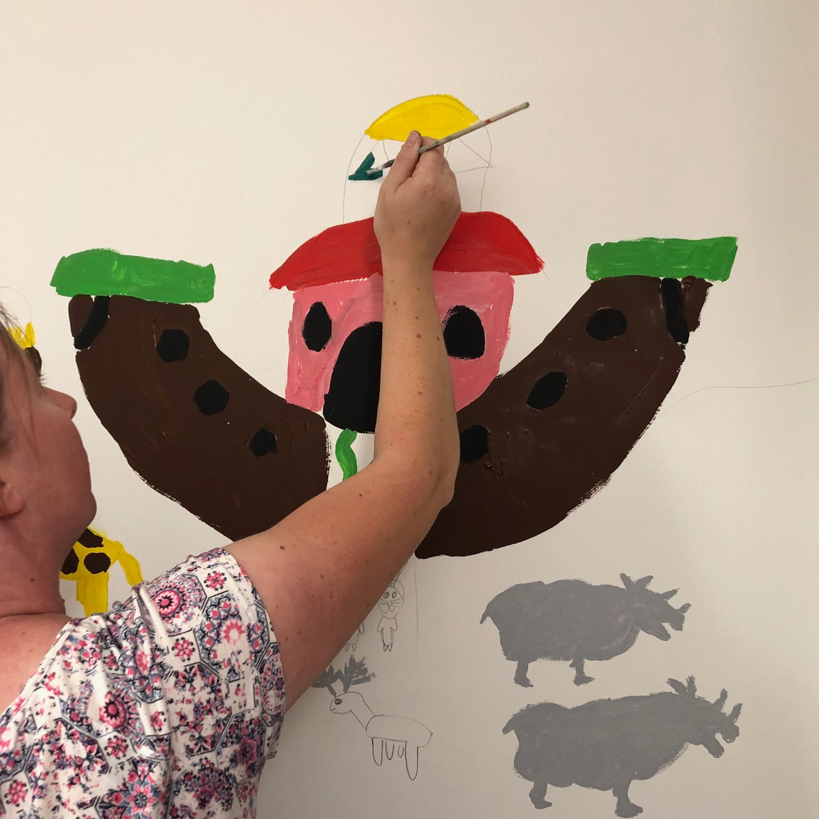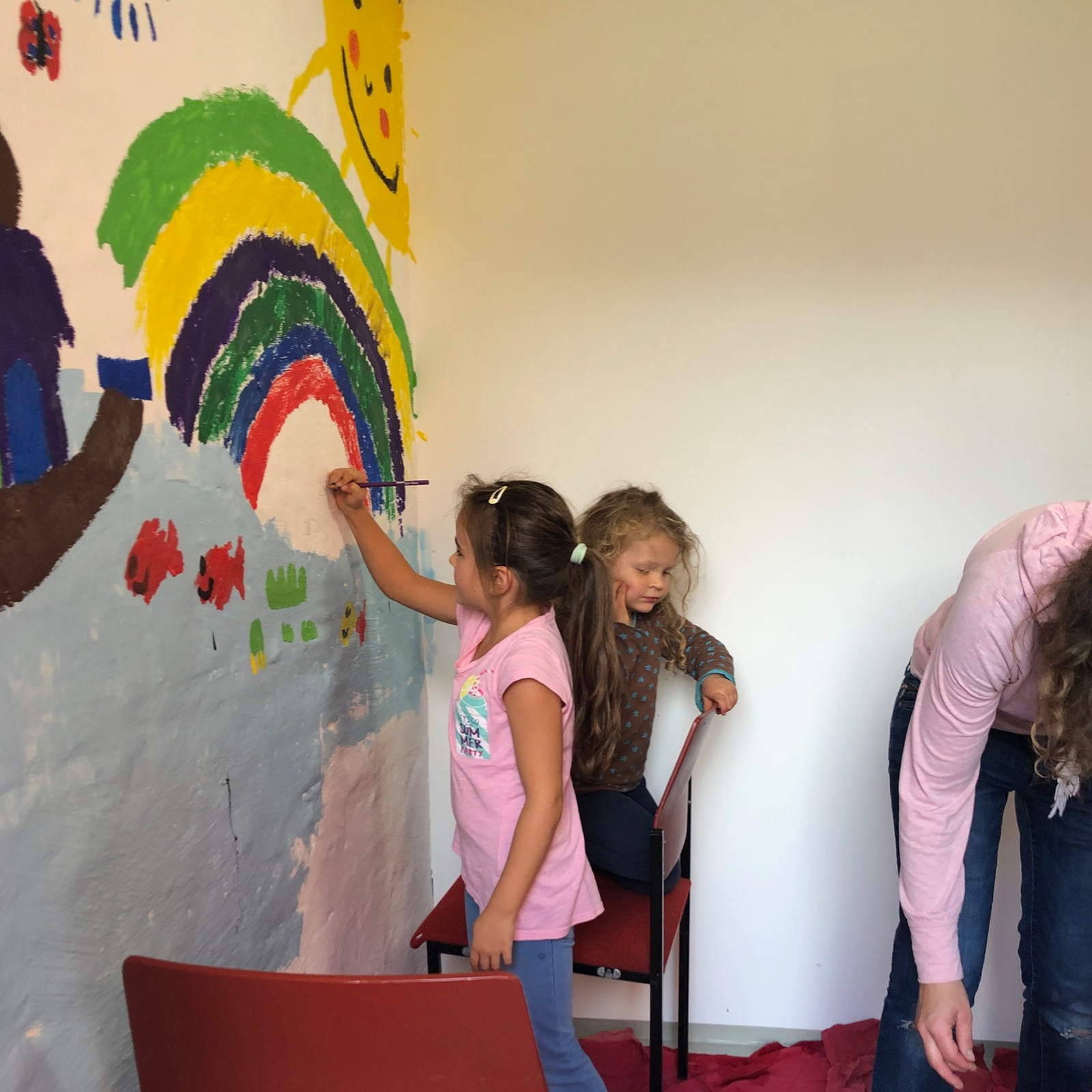 Die Idee, den Raum gemeinsam mit den Kindern fröhlich zu gestalten, sorgte sofort für Begeisterung. Zu Beginn erzählte Pastorin Stefanie Deichmann die biblische Geschichte von Noah und seiner Arche anhand eines Bilderbuches. Anschließend ließen sich die kleinen Künstlerinnen und Künstler von dieser Geschichte inspirieren und machten sich ans Werk: Auf den Wänden entstanden die Arche, eine Taube mit einem Olivenzweig und viele bunte Tiere.