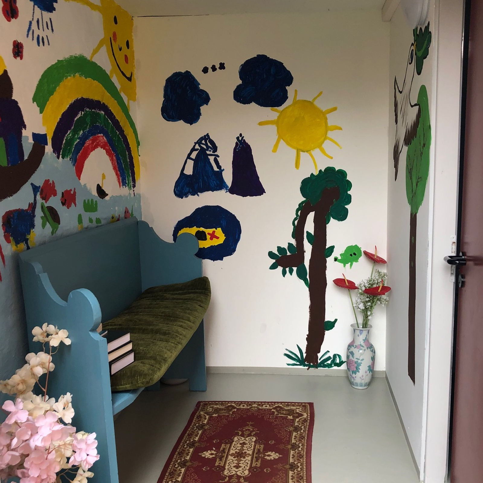 Bei Keksen, Obst und Saft bewunderten Kinder, Eltern und Pastorin Deichmann das fertige Kunstwerk. Die bunt bemalten Wände machen die neue Toilette nun zu einem fröhlichen Ort. Auch der kleine Wartebereich mit einer alten Kirchenbank fügt sich harmonisch ein und verleiht dem Raum besonderen Charme.