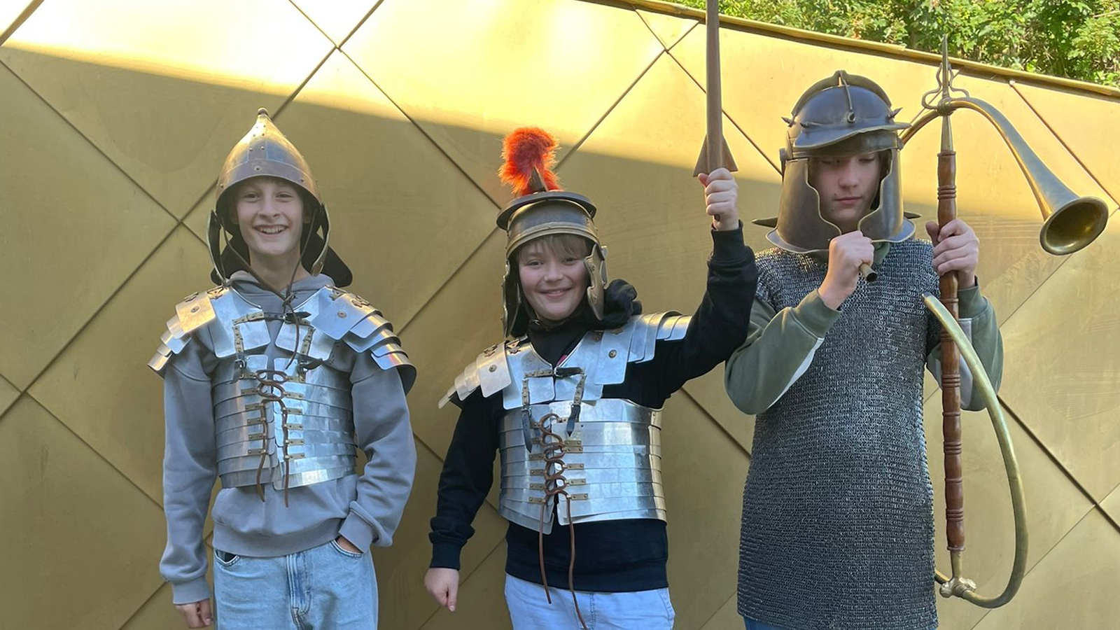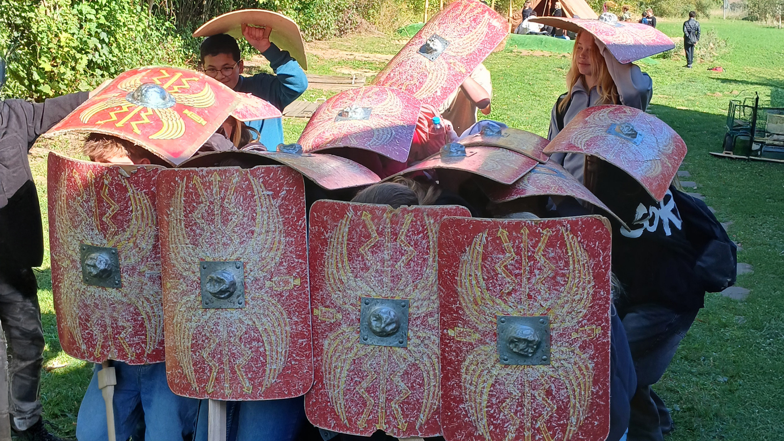 Ein Höhepunkt des Besuchs war die Rekonstruktion eines römischen Katapults, das die Ingenieurskunst der Antike eindrucksvoll verdeutlichte und sogar ausprobiert werden durfte. Zudem konnten die Schüler Kettenhemden, Brustpanzer und Helme anlegen, sich im Bogenschießen versuchen und Getreide mahlen – ein praxisnaher Einblick in das Leben römischer Legionäre.
