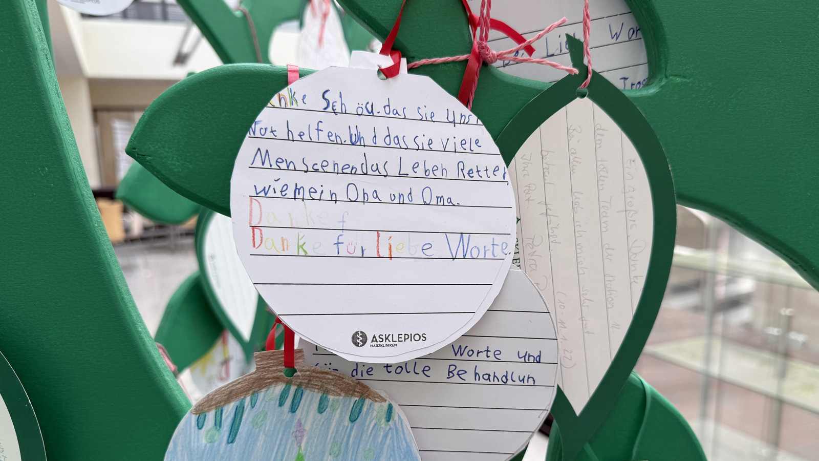 Den Danke-Baum aus Holz gibt es bereits seit 2019 im Foyer der Klinik. Angehörige, Besucherinnen und Besucher sowie Mitarbeiterinnen und Mitarbeiter können dort auf kleinen Blättern in Blattform handgeschriebene Botschaften des Dankes hinterlassen. Die Asklepios Harzklinik Goslar hat das Dankebaum-Projekt damals mit Unterstützung der Lebenshilfe Goslar ins Leben gerufen.