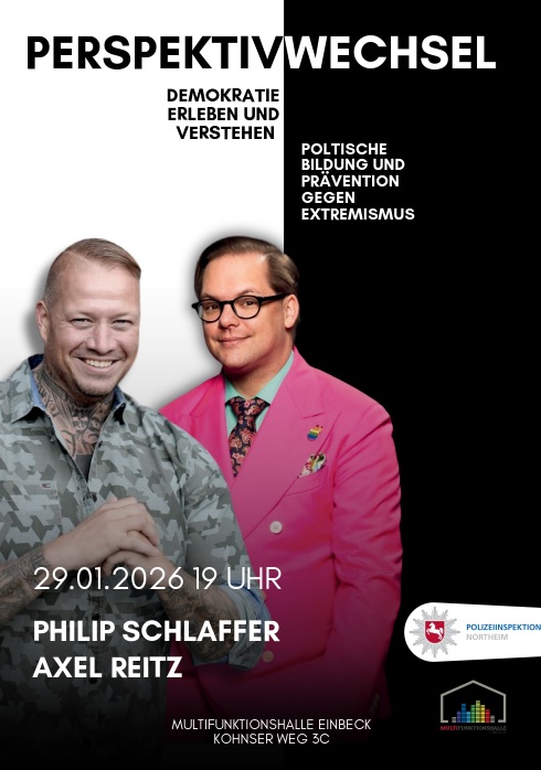 Ein Höhepunkt des Projekts ist die öffentliche Abendveranstaltung am Donnerstag, 29. Januar 2026, um 19 Uhr in der Multifunktionshalle Einbeck. In einem Talk- und Dialogformat diskutieren Schlaffer und Reitz über Demokratie, Meinungsfreiheit, politische Streitkultur und gesellschaftliche Verantwortung. Das Publikum soll aktiv einbezogen werden, Fragen und unterschiedliche Perspektiven sind ausdrücklich erwünscht.