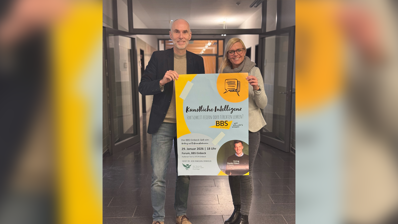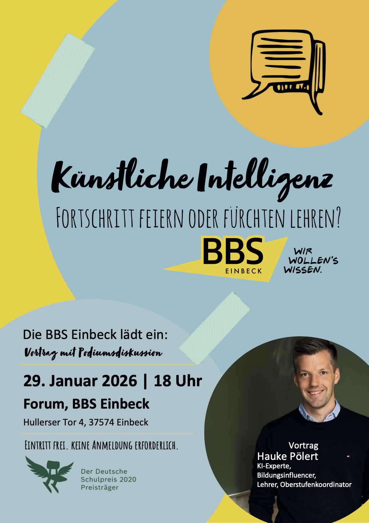 Nach dem Vortrag wird das Thema in einer Podiumsdiskussion weiter vertieft. Vertreterinnen und Vertreter aus Schule, Wirtschaft, Elternschaft und Schülerschaft beleuchten die Auswirkungen von Künstlicher Intelligenz aus unterschiedlichen Blickwinkeln. Auf dem Podium sitzen Manuel Kempf von der KWS Einbeck, Dr. Jan Taubert von Sartorius Göttingen, Hauke Pölert, Vanessa Paulat als Vorsitzende des Schulelternrates, Anna-Lena Engelhardt von den BBS Einbeck sowie eine Schülervertreterin oder ein Schülervertreter. Ein zusätzlicher Platz bleibt offen, um auch Stimmen aus dem Publikum einzubeziehen. Moderiert wird die Runde von Eberhard Schmah.