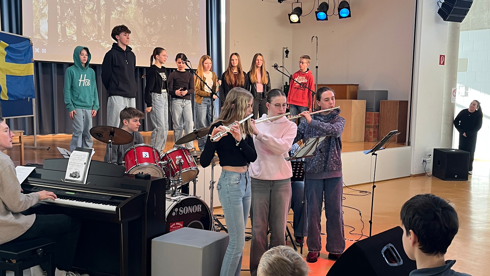 Auch musikalisch beeindruckte die Aufführung. Das Spektrum reichte von Rap und Pop bis hin zu ruhigen, gefühlvollen Einlagen. Die Schulband begleitete das Musical mit großer Präzision und Ausdrucksstärke. Geheimnisvolle und liebevoll gestaltete Bühnenbilder unterstützten die Handlung wirkungsvoll und sorgten für stimmungsvolle Szenenwechsel.