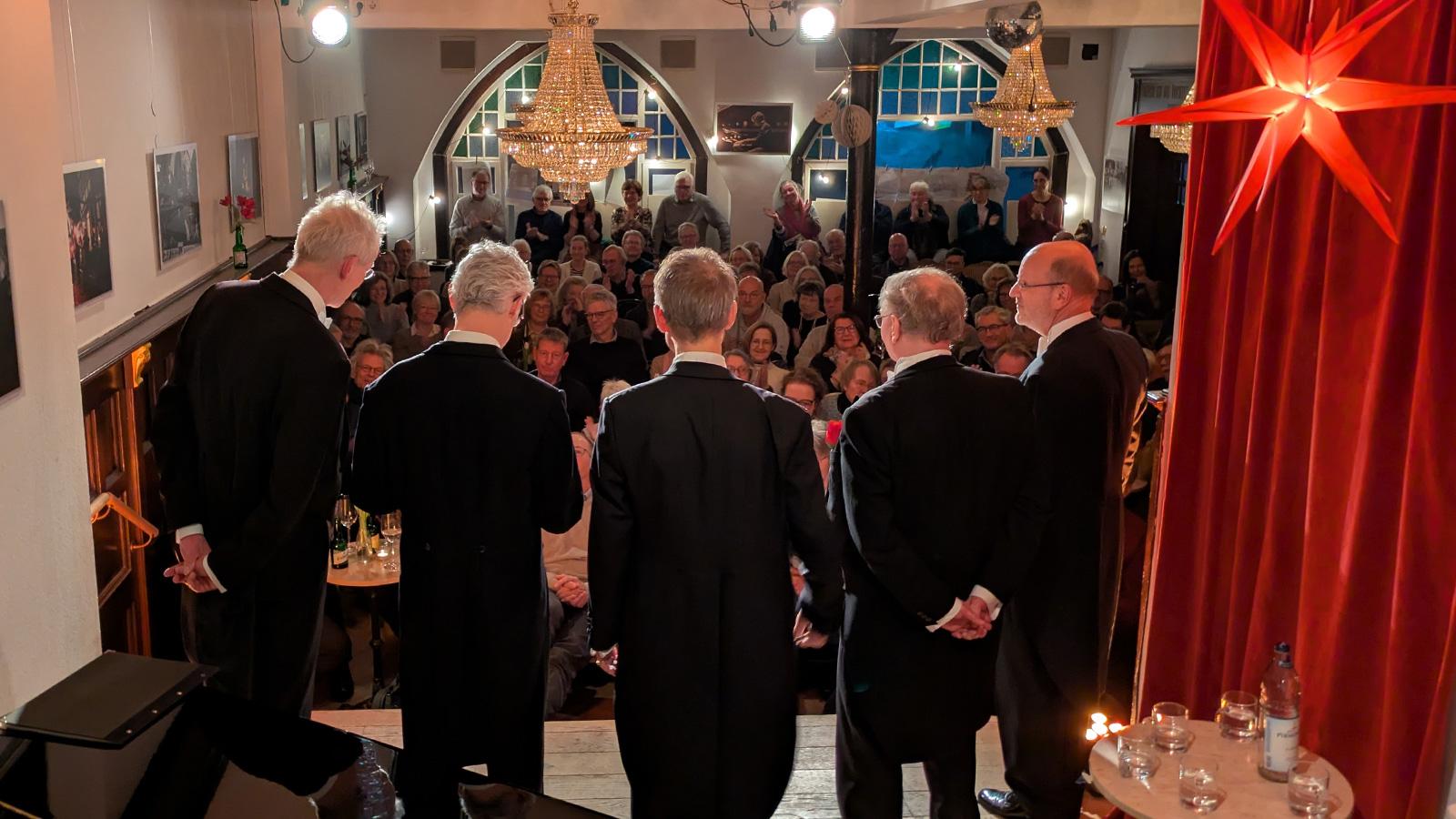Bereits Ende Januar wurde der „Testballon“ gestartet – und er stieg sofort in den siebten Kulturhimmel. Das erste Konzert im neuen Kammersaal war ebenso ausverkauft wie das Abschiedskonzert zuvor. Gut 100 Gäste fanden sich unter den bekannten goldenen Kronleuchtern ein, um das Vokalensemble „Schall und Rauch“ zu erleben. Die Atmosphäre war bemerkenswert ausgelassen: Man spürte förmlich die Erleichterung und Freude darüber, dass die kulturelle Flamme an diesem geschichtsträchtigen Ort nun ohne Unterbrechung weiterbrennt.