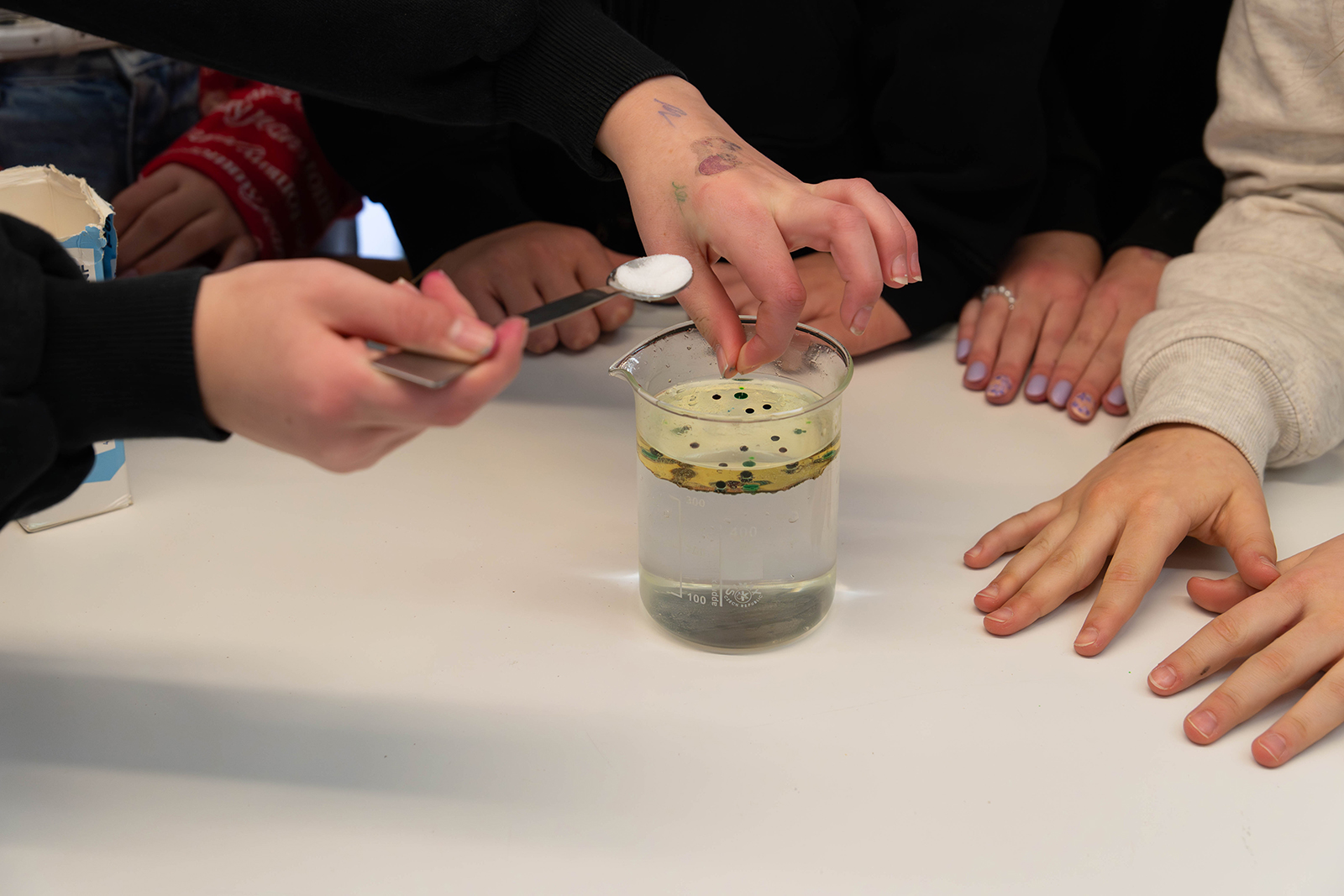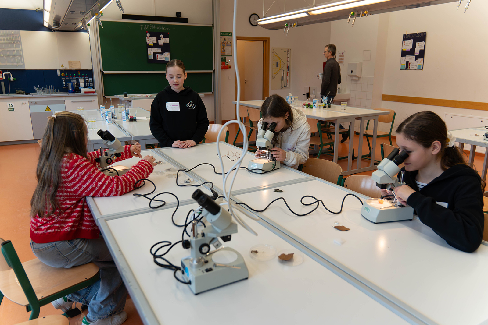 Im naturwissenschaftlichen Bereich standen mehrere Experimentierstationen bereit. Unter Anleitung durften die Kinder Proben unter dem Mikroskop betrachten und Details erkennen, die mit bloßem Auge verborgen bleiben. Daneben wurden Versuche rund um physikalische und chemische Phänomene angeboten. Besonders anschaulich zeigte sich ein Experiment, bei dem sich Farbspiele in einem Wasserglas entfalteten und Reaktionen sichtbar machten. Die Stationen waren so aufgebaut, dass die Kinder nicht nur zuschauten, sondern eigenständig ausprobierten, beobachteten und Fragen stellten.