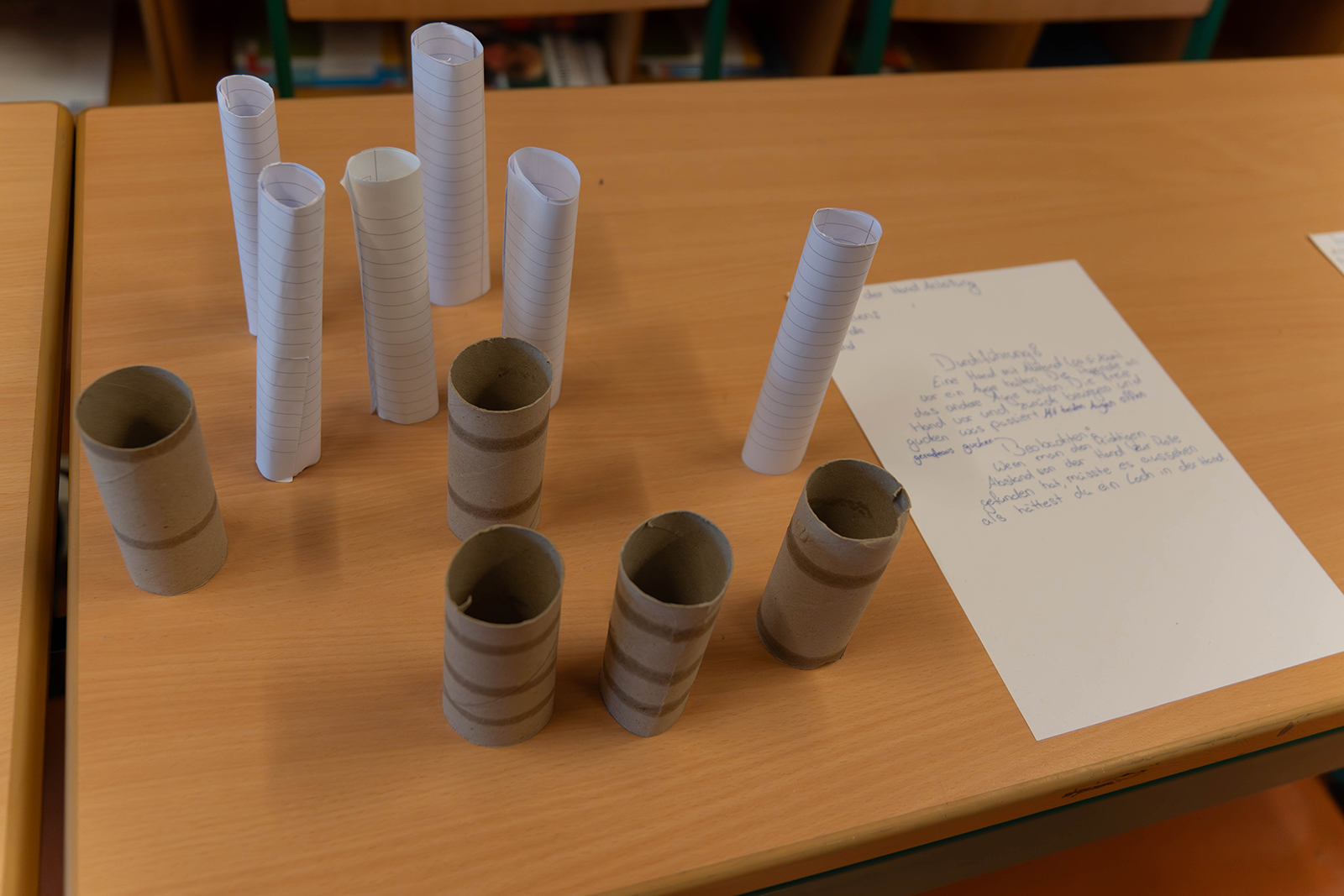 Ein weiterer Raum war der Technik gewidmet. Hier konnten Lego-Roboter in Aktion erlebt werden. Schülerinnen und Schüler der höheren Jahrgänge sowie Lehrer erklärten, wie die Modelle aufgebaut sind und welche Befehle sie ausführen. An einzelnen Tischen bestand die Möglichkeit, selbst einfache Abläufe zu testen oder bei einer spielerischen Aufgabe – etwa einem technikgestützten Fußballspiel – die Funktionsweise kennenzulernen. Ergänzend wurden Stationen angeboten, an denen die eigenen Sinne geprüft wurden, um den Bezug zwischen Technik und Wahrnehmung greifbar zu machen.