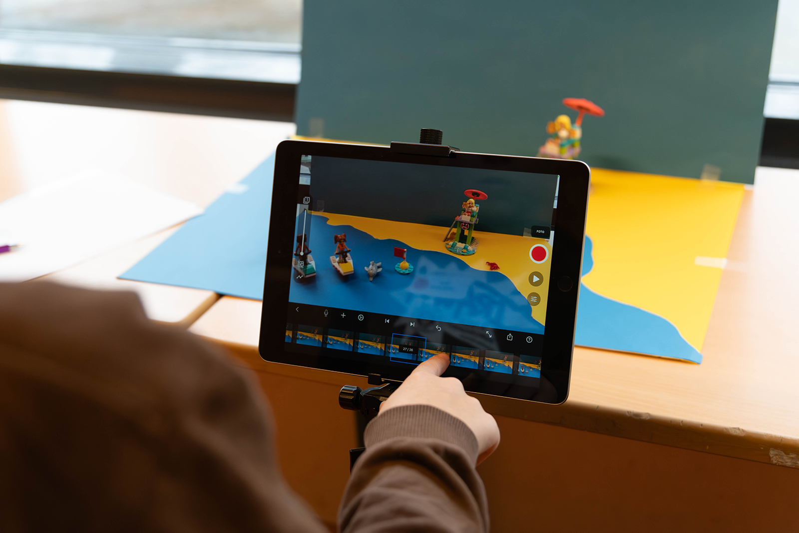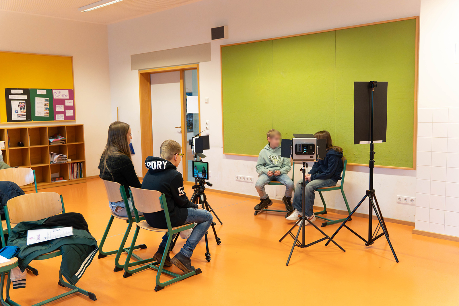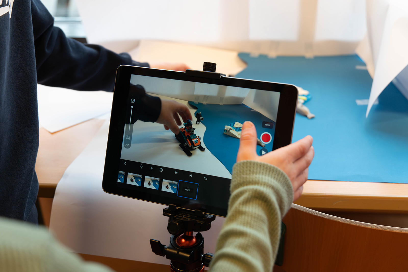 Parallel dazu entstand in einem weiteren Raum ein kleines Medienlabor. Mit Tablets sowie Figuren und Bausteinen wurden kurze Filmsequenzen produziert. Schülerinnen und Schüler erklärten, wie Einstellungen geplant und Szenen aufgebaut werden. Zudem hatten die Viertklässler Gelegenheit, erste Interviews zu führen und sich in der Rolle von Fragestellenden auszuprobieren. Dabei ging es nicht nur um Technik, sondern auch um präzises Zuhören und verständliches Formulieren.