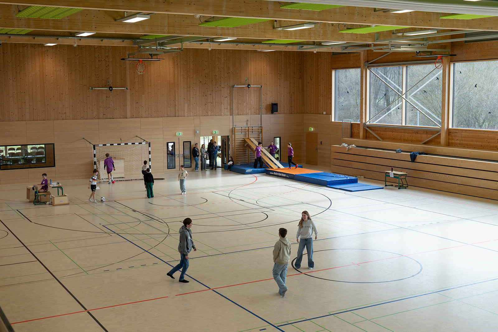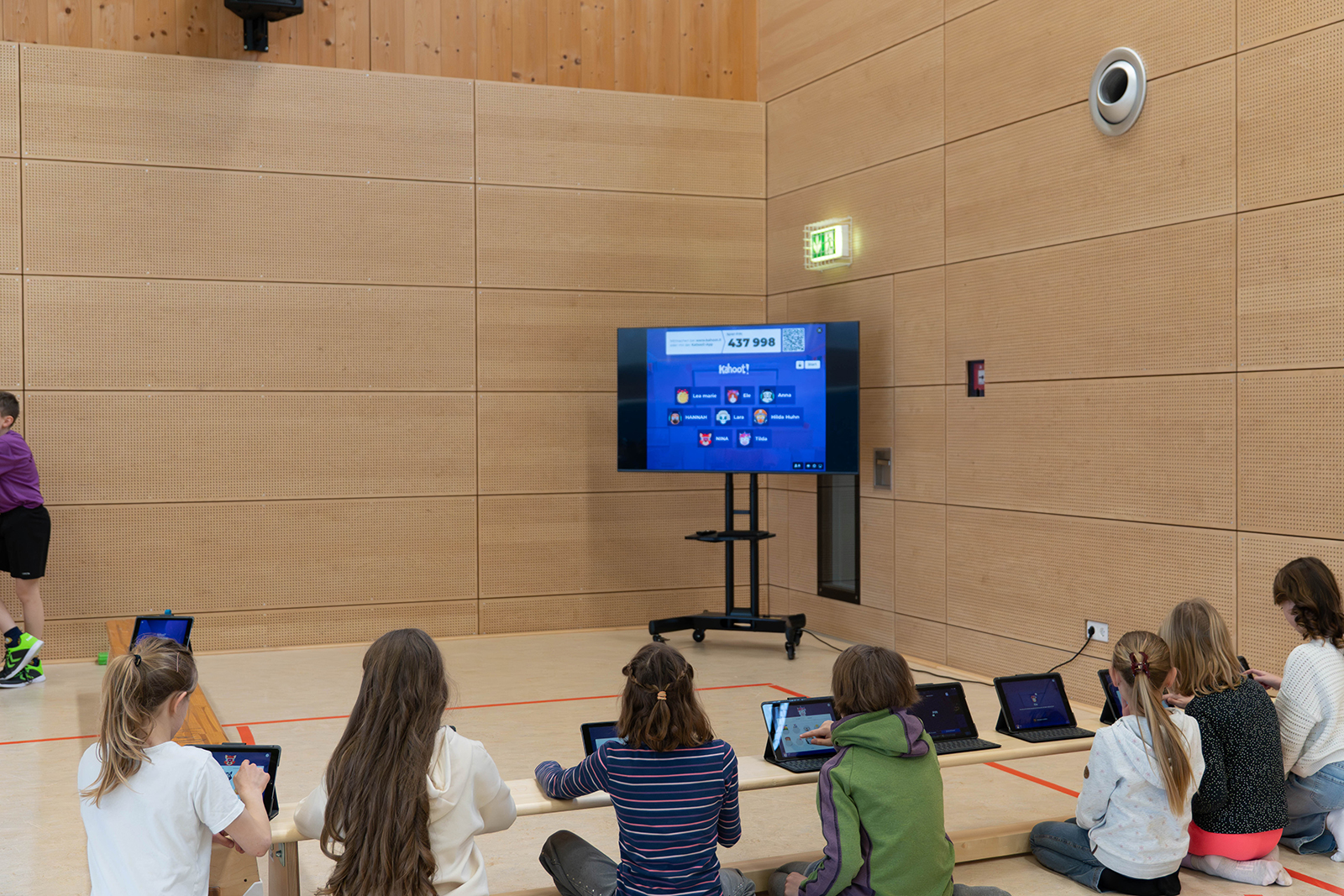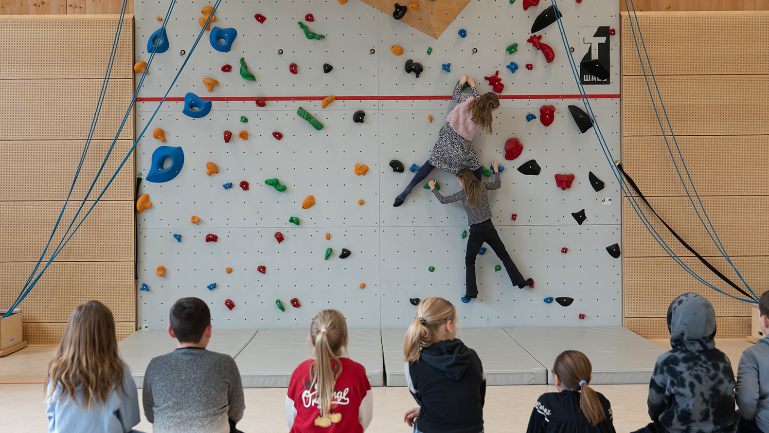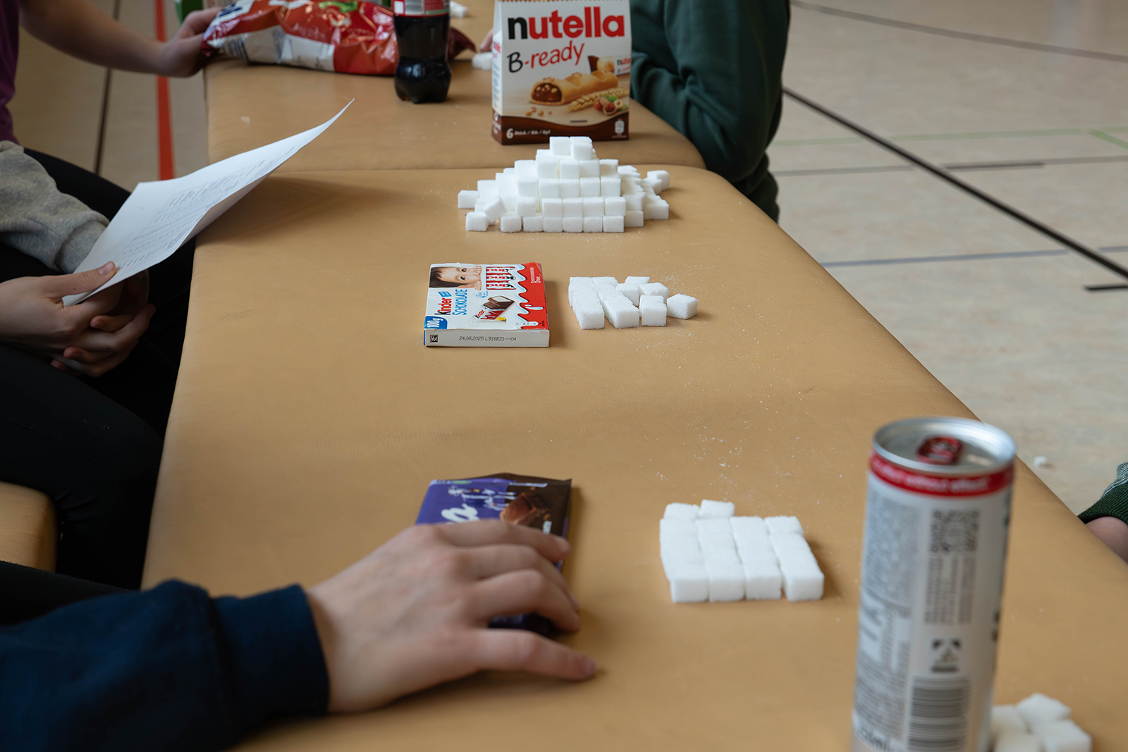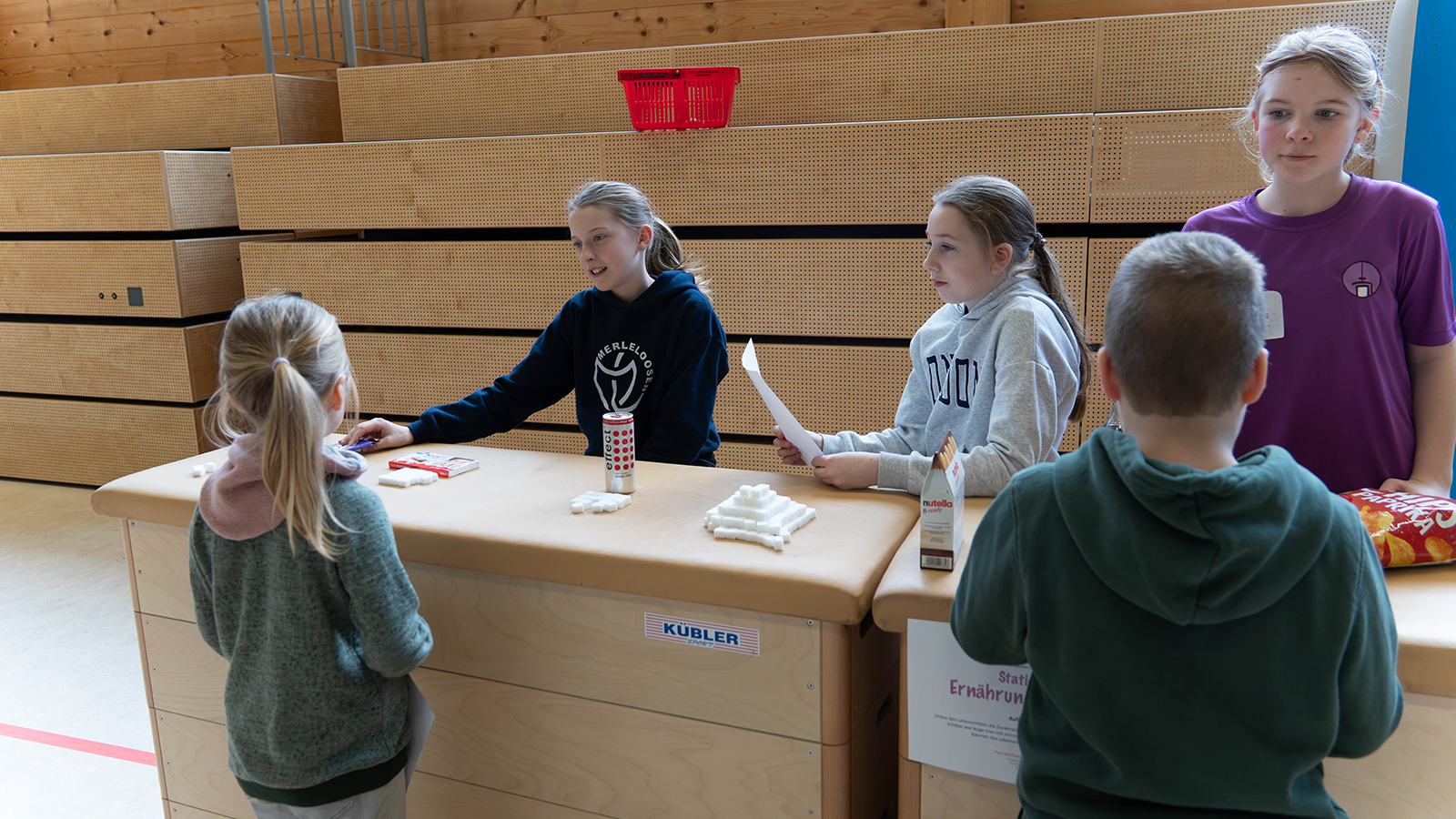 Bewegung prägte das Bild in der großen Sporthalle. Dort war eine Sprungschanze aus Bänken aufgebaut, auf der ein Skisprung nachempfunden werden konnte. An der schuleigenen Kletterwand wagten sich viele Kinder an erste Boulderübungen. Weitere Stationen luden dazu ein, die eigene Wurf- oder Schussgeschwindigkeit zu messen und mit anderen zu vergleichen. Digitale Quizformate sorgten zusätzlich für Abwechslung, etwa mit Fragen zu Sportarten oder zur Zusammensetzung von Lebensmitteln. Bei einem Ernährungsquiz mussten Zuckerwürfel den passenden Produkten zugeordnet werden, um ein Gefühl für versteckte Zuckermengen zu entwickeln.