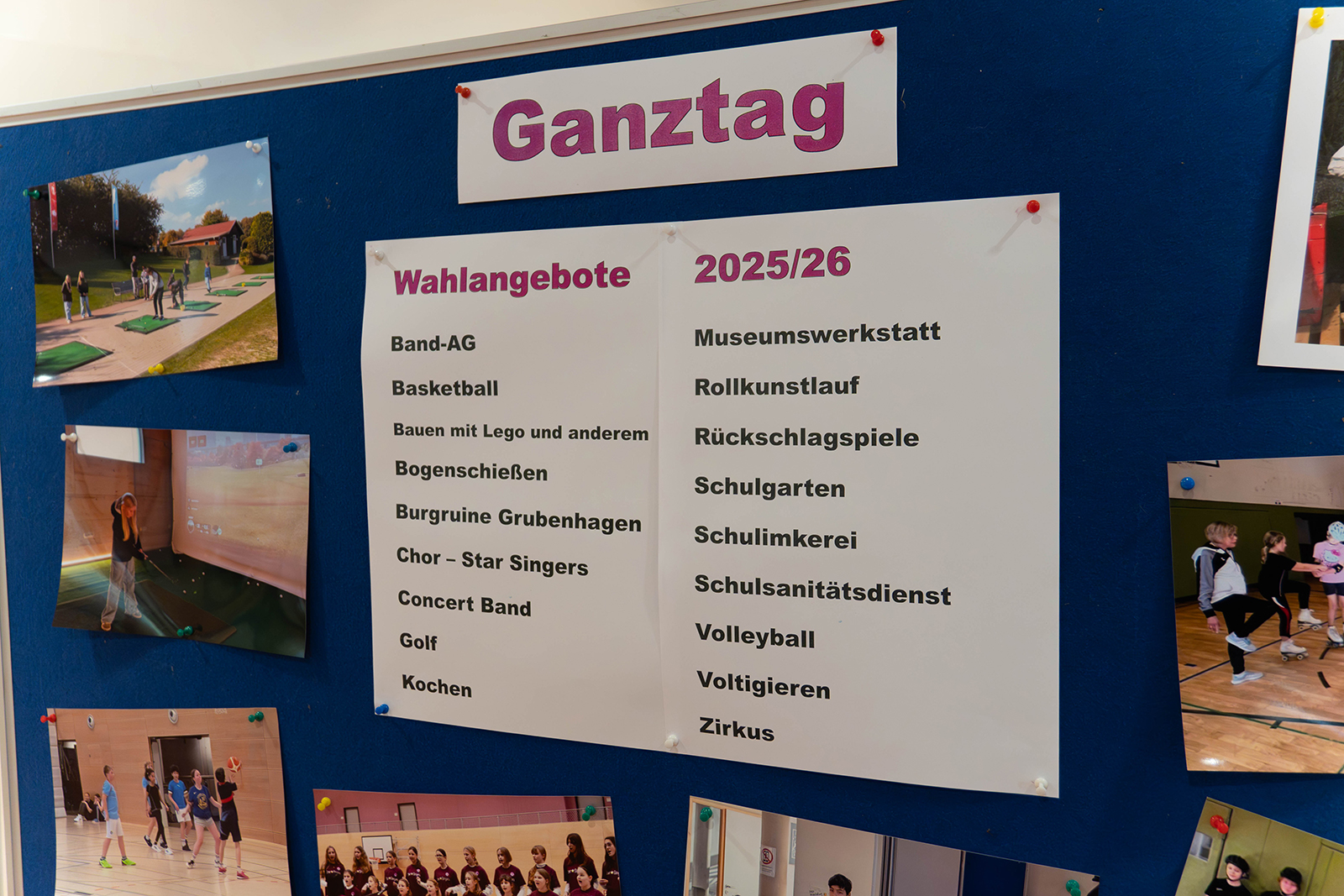 Das Ganztagskonzept ist flexibel gestaltet: In Jahrgang 5 ist die Teilnahme freiwillig, in Jahrgang 6 wird mindestens ein Angebot gewählt. Neben Arbeitsgemeinschaften wie Band, Bogenschießen, Golf, Kochen, Schulgarten, Schulimkerei oder Zirkus gibt es sogenannte Schülerclubs, in denen Jugendliche eigene Angebote für Mitschülerinnen und Mitschüler organisieren. Viele Kurse entstehen in Kooperation mit Fachleuten und Vereinen.