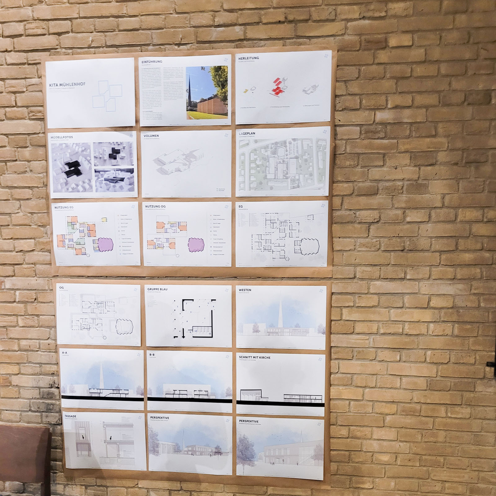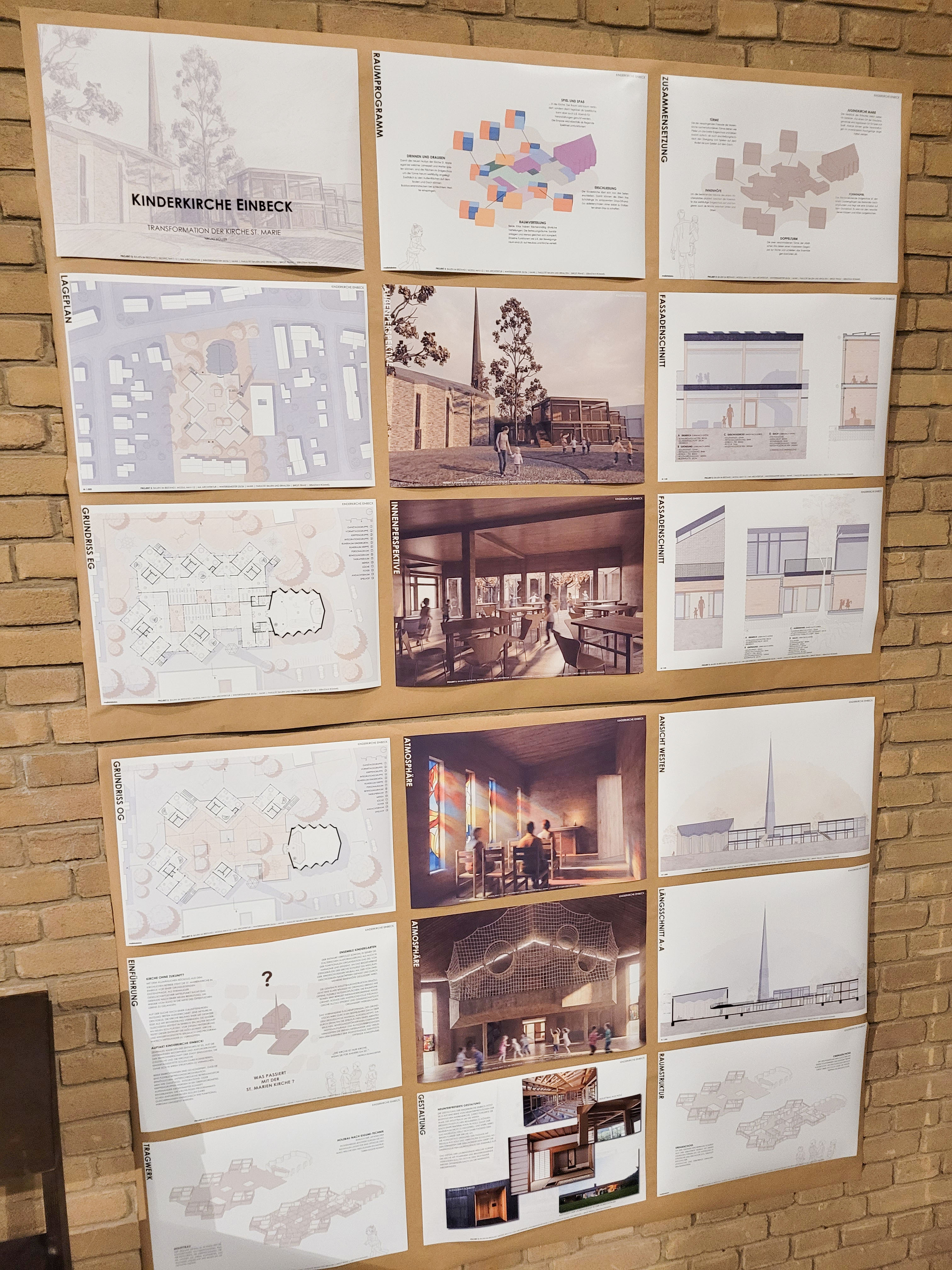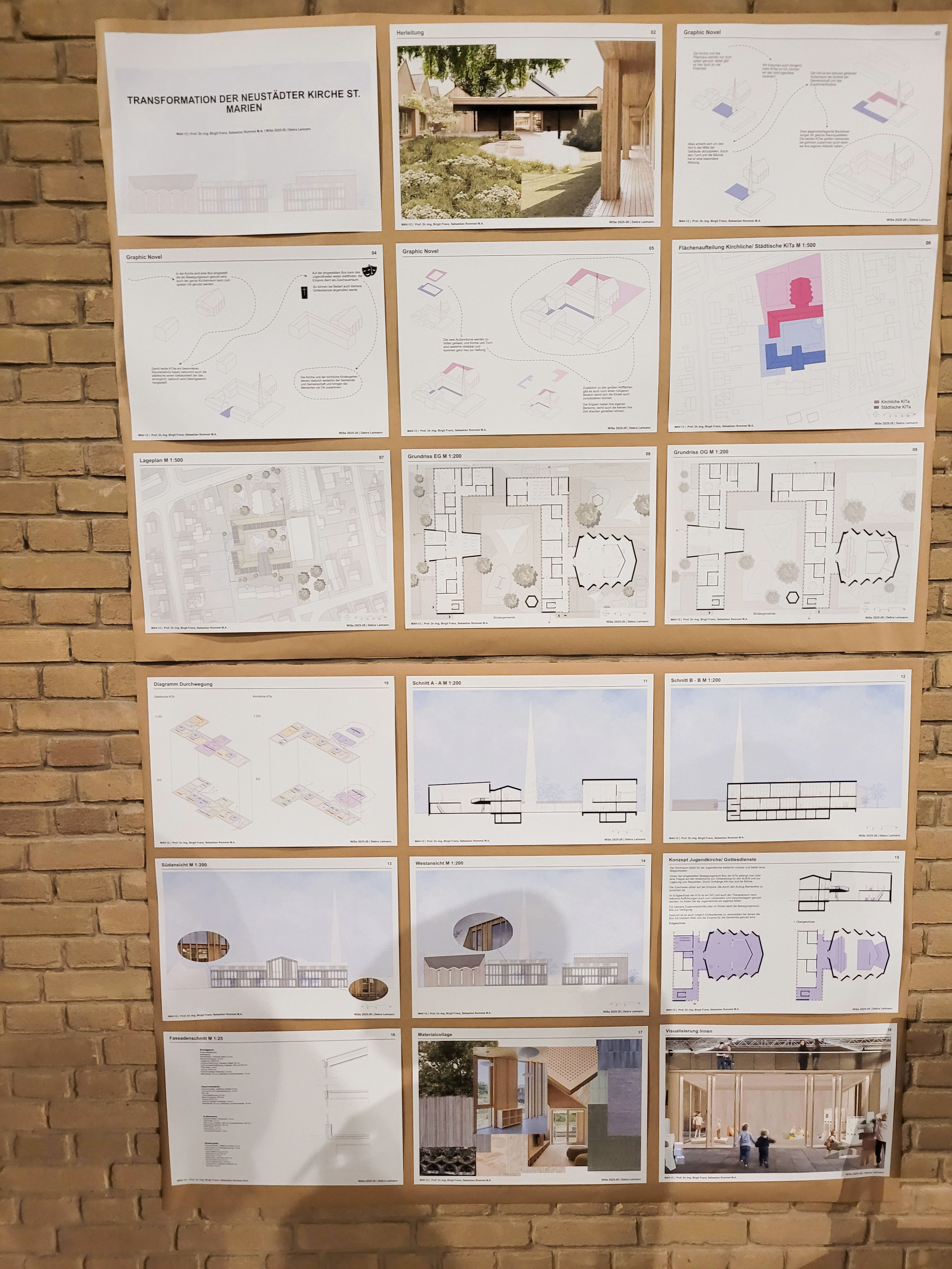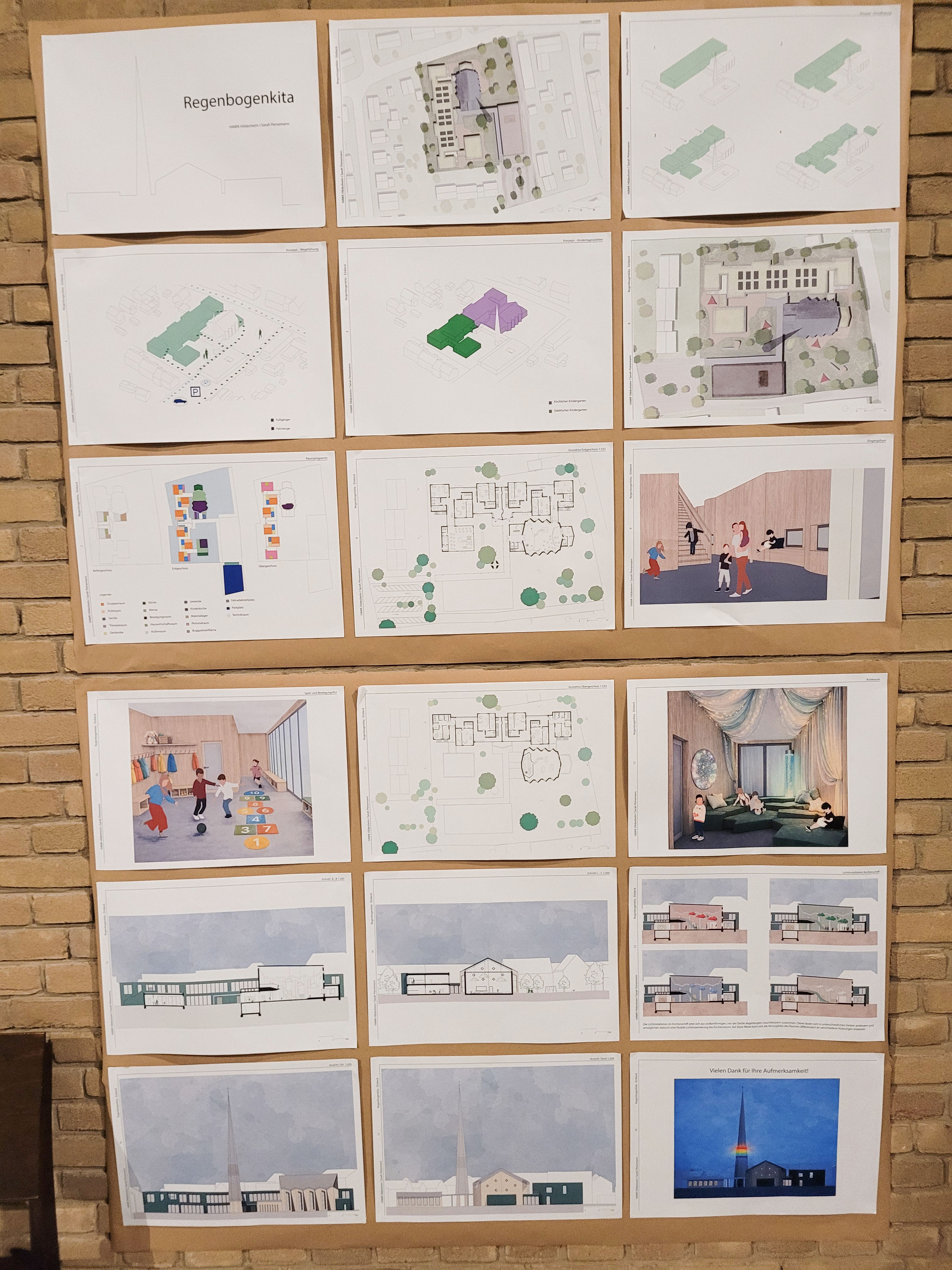 Ausgangspunkt für die studentischen Arbeiten war unter anderem die Frage, ob sich auf dem Gelände zwei Kindergärten – ein staatlicher und ein kirchlicher – realisieren ließen. Diese mögliche Nutzung bildete eine zentrale Grundlage mehrerer Entwürfe und stellte die Verbindung zwischen Kirchenareal und künftiger Bildungsinfrastruktur her.