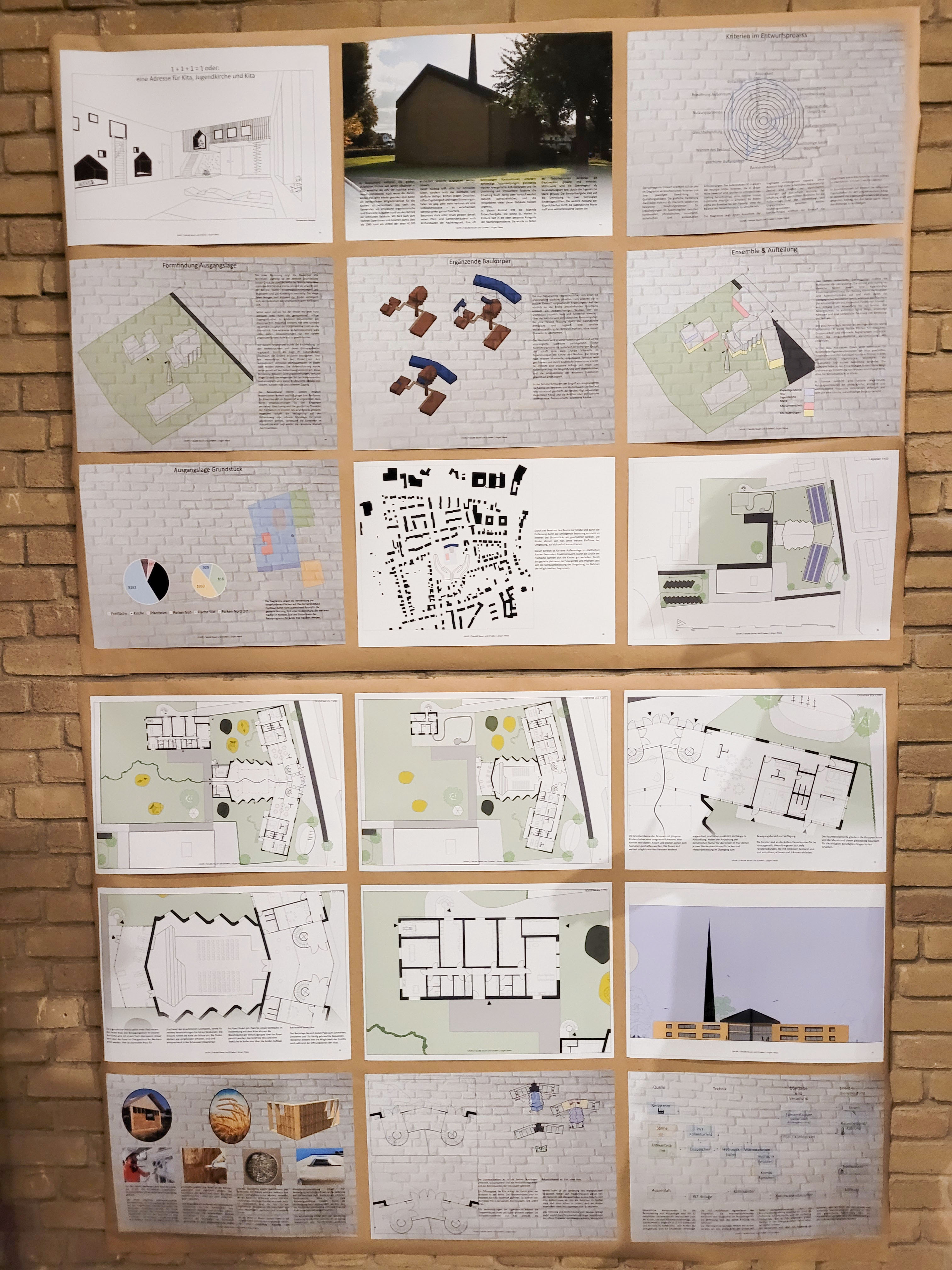 Professorin Franz unterstrich unverändert: „Die Kirche soll ein Ort der Gemeinschaft bleiben.“ Es wurde der Bestand mit den Baulasten geprüft, die Substanz vor Ort gesichtet, Raum- und Flächenprogramme erstellt und anhand von Film und Fotos Visionen geschaffen. Zudem beschäftigten sich die Studenten und Studentinnen mit Kita-Pädagogik und Kirchen-Reformation, um die Räume bestmöglich zu gestalten bzw. zu erhalten.