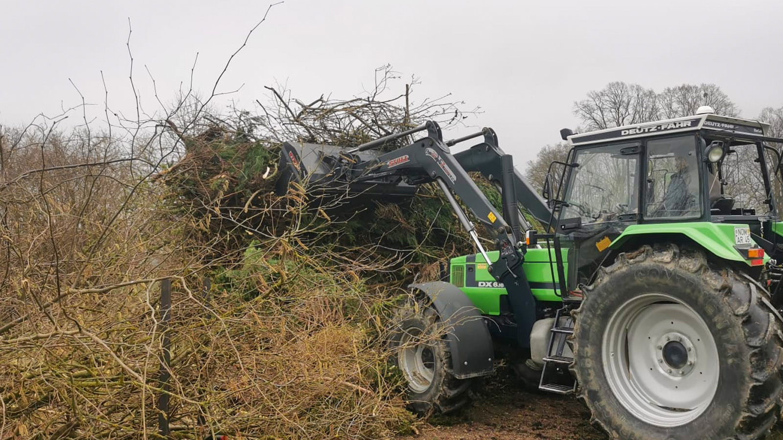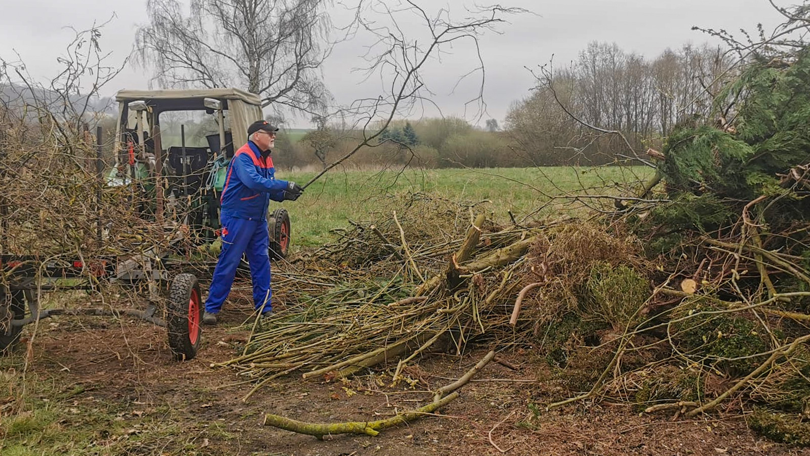 Unter vollem Einsatz der örtlichen Helfer und mit tatkräftiger Unterstützung durch landwirtschaftliches Gerät – darunter ein markanter Deutz-Fahr-Schlepper im Frontladereinsatz – wurde bereits am ersten Vormittag eine beachtliche Menge an Baum- und Strauchschnitt zusammengetragen.