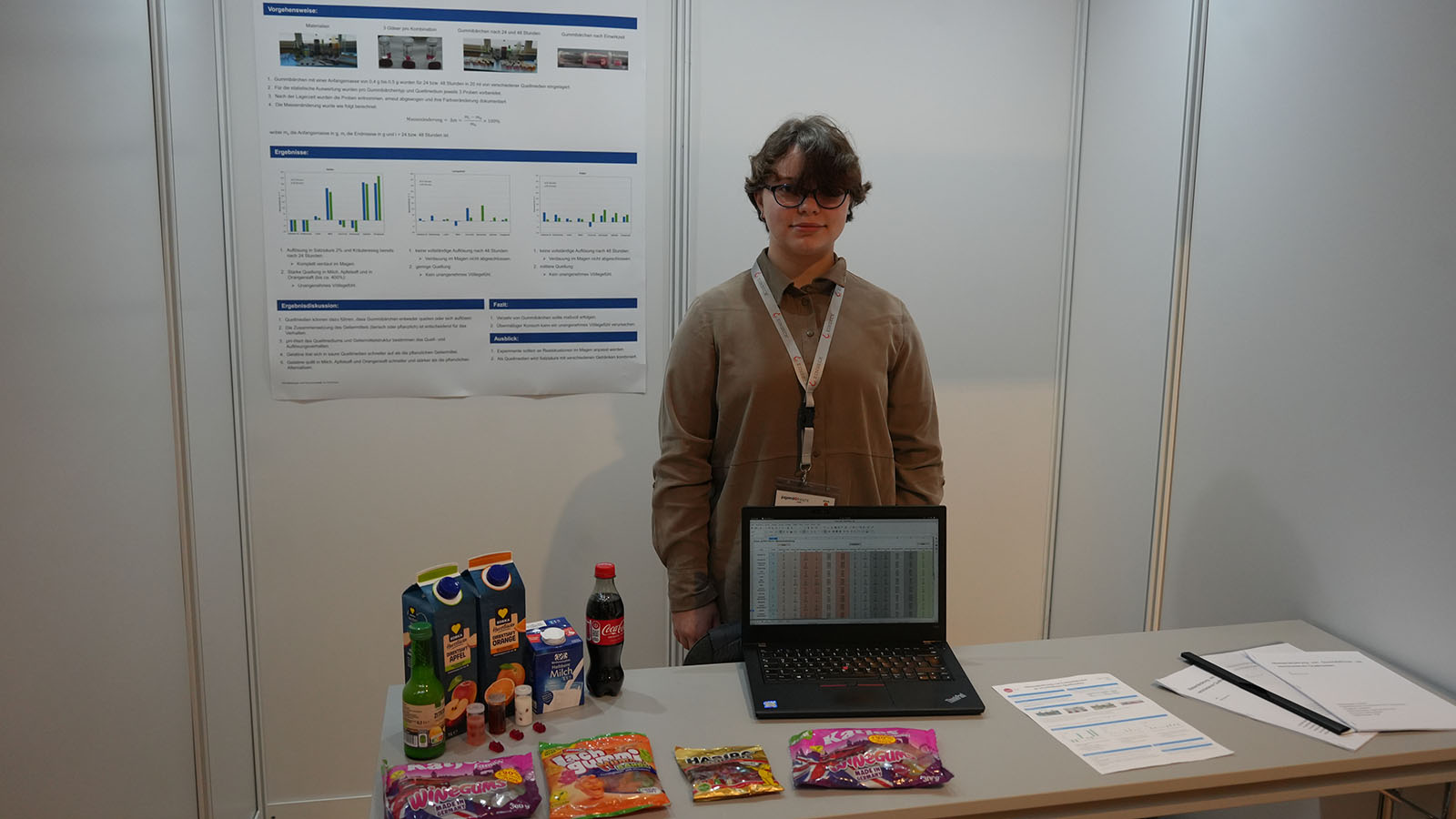 Neben dem Siegerteam war mit Emne Aloui eine weitere Teilnehmerin aus der Region vertreten – ebenfalls vom Corvinianum. Ihr Projekt beschäftigte sich mit der Massenänderung von Gummibärchen in unterschiedlichen Flüssigkeiten. Dabei untersuchte sie, wie sich die Süßwaren in Medien wie Säften, Milch oder Coca-Cola mit verschiedenen pH-Werten verändern. „Ich will Kindern veranschaulichen, was im Magen passiert, wenn man ein Völlegefühl nach dem Verzehr von Süßigkeiten und Getränken hat“, gab die Nachwuchs-Forscherin ihre Intention an.