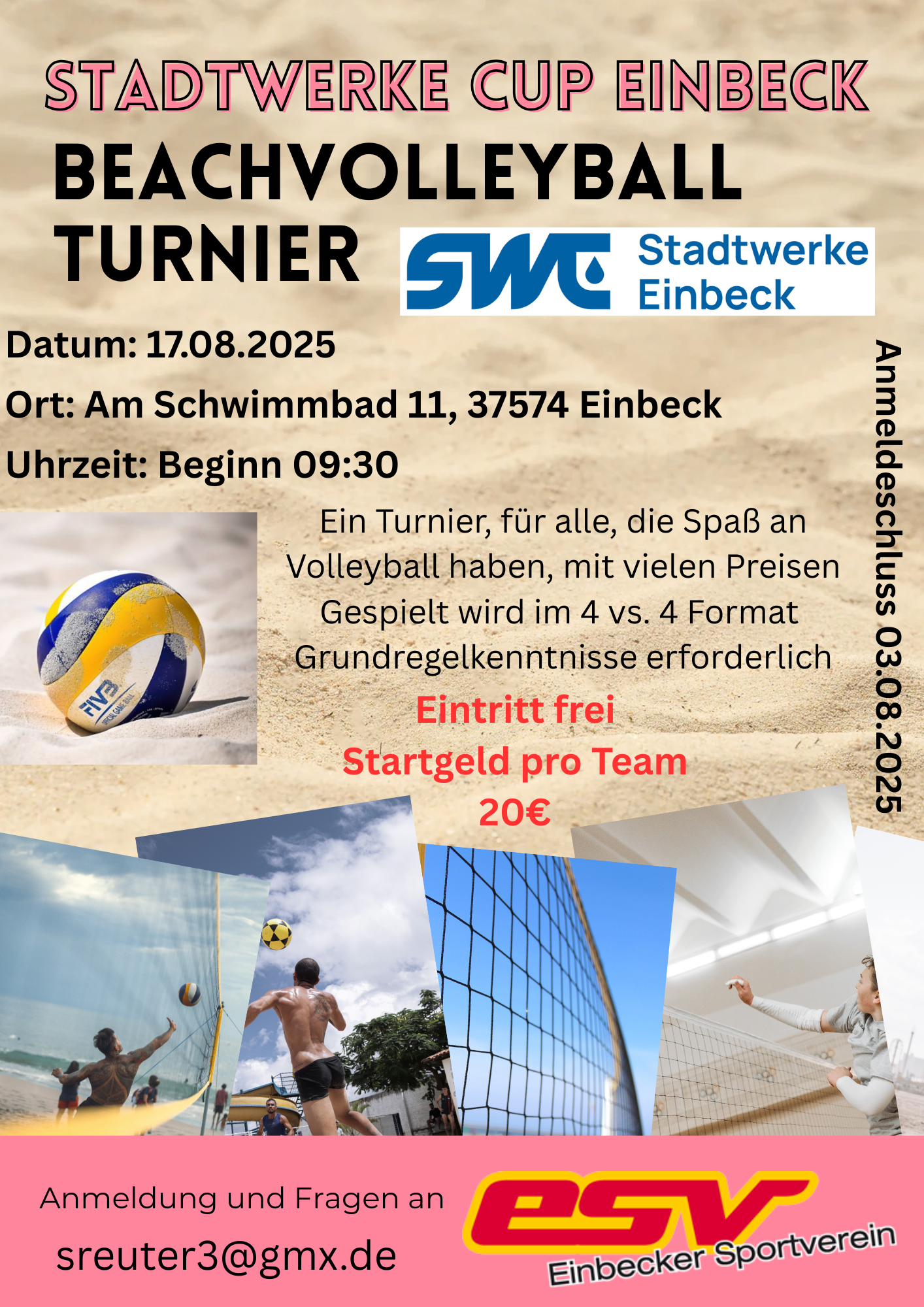Einbeck (red). Am 17. August können alle zeigen, was sie im Sand können. Der ESV veranstaltet in Kooperation mit den Stadtwerken Einbeck ein Beachvolleyballturnier im Einbecker Freibad. Teilnehmen können alle, die die Grundtechniken und Grundregeln im Volleyball beherrschen. Gespielt wird 4 gegen 4, Turnierbeginn ist 9:30 Uhr. Die Startgebühr pro Team beträgt 20 €, der Freibadeintritt für Teammitglieder ist frei. Die Stadtwerke Einbeck sponsern attraktive Preise: einen Wanderpokal, Medaillen, Volleybälle und Wertmarken für das Schwimmbad.