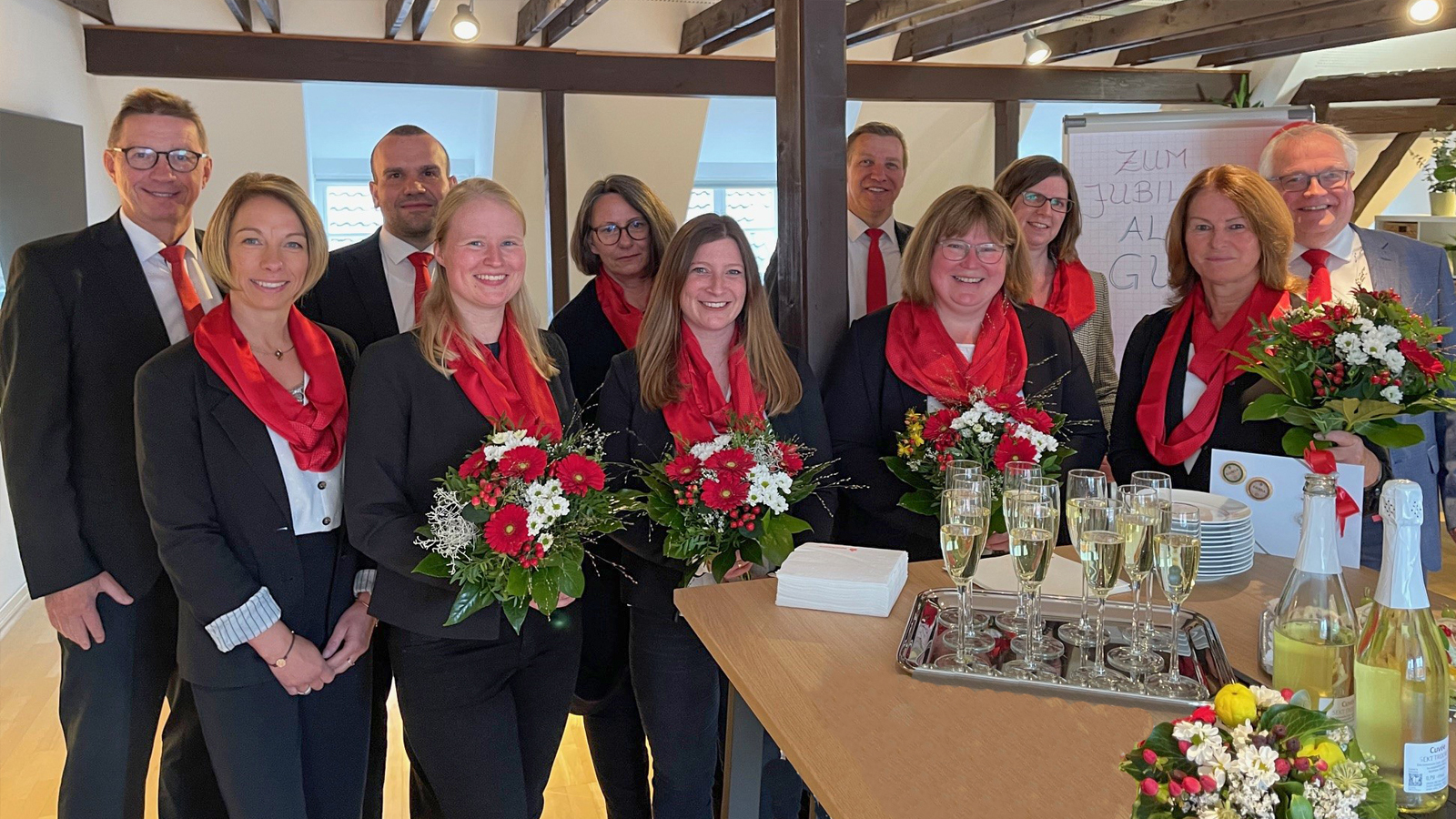 Seit 40 Jahren ist Sabine Hundertmark eine feste Größe im Kundenservice und erste Anlaufstelle für viele Kundinnen und Kunden. Ihr 30-jähriges Arbeitsjubiläum feiert Michelle Fehlig, die im Personalbereich tätig ist. Auf jeweils zehn Jahre blicken Christina Bätz, Kundenberaterin in der Filiale Hubeweg, sowie Justine Drinkmann aus der Organisationsabteilung zurück.