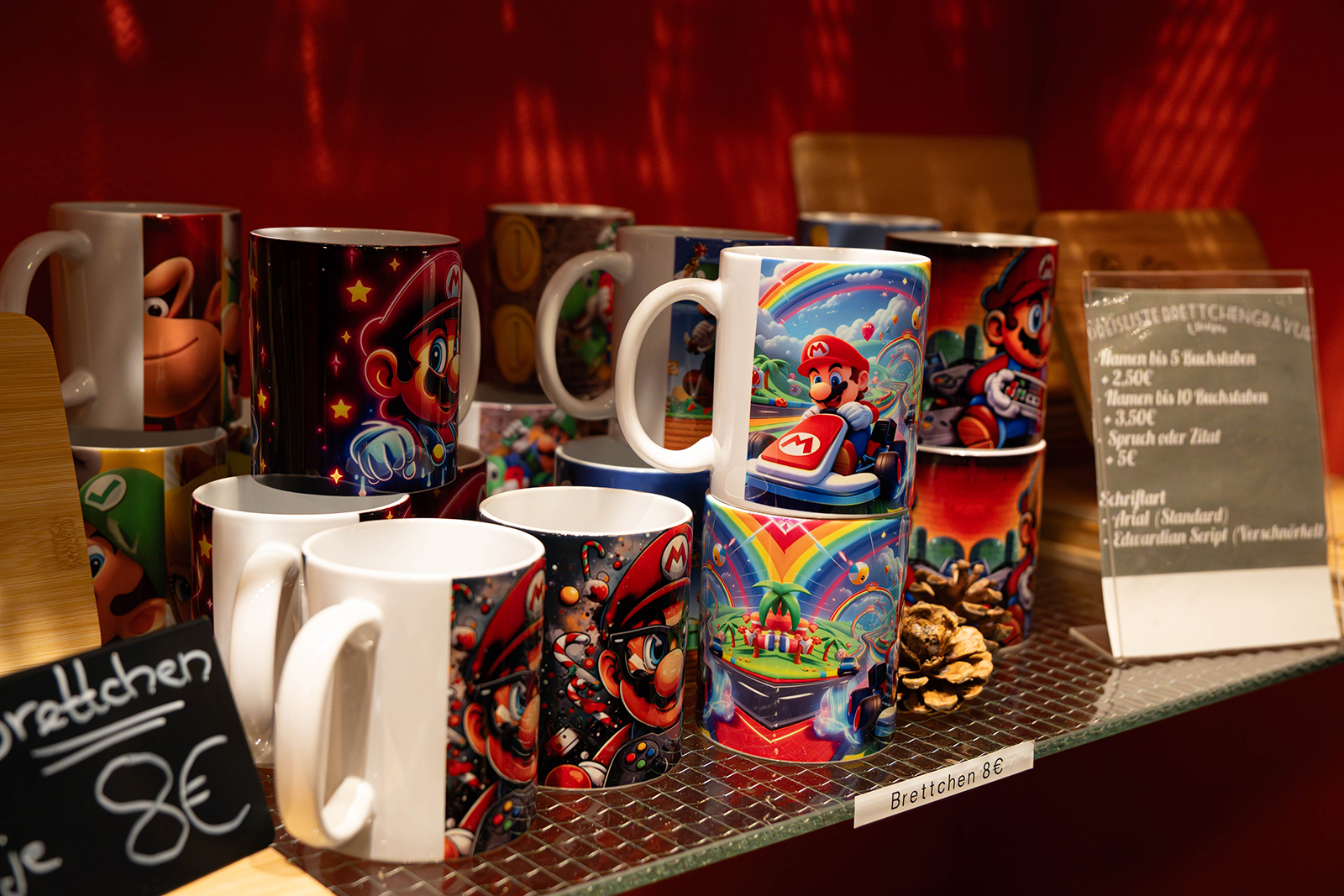 Parallel zum Spielbereich gibt es eine breite Palette an Artikeln rund um Gaming und Anime. Dazu gehören Merchandise-Produkte wie bedruckte Tassen und Holzbrettchen, Sammelfiguren, 3D-Druck-Modelle sowie Konsolen und Spiele für Systeme wie SNES, PlayStation, Xbox und mehr. Auch Reparaturen an Konsolen und Controllern werden angeboten.