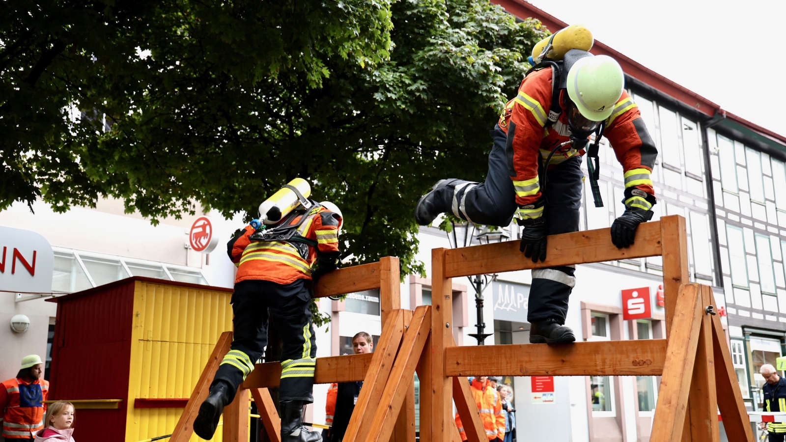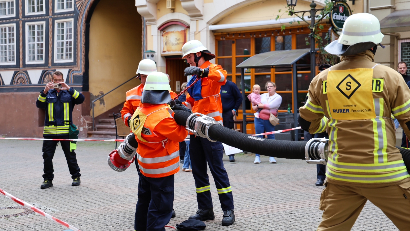 Das Wetter zeigte sich wechselhaft: Am Vormittag schien zunächst die Sonne, später sorgte Regen für nasse Wettkampfbahnen. Weder die Stimmung der Mannschaften noch die Begeisterung der Zuschauer konnte das trüben. Hunderte Gäste säumten die Innenstadt, feuerten die Teams an und erlebten bei Kaffee und Kuchen in den vielen gastronomischen Betrieben am Markt- und Möncheplatz Feuerwehrsport hautnah. Ein besonderes Highlight: Das Wettbewerbsgeschehen wurde live auf eine Großleinwand am Möncheplatz übertragen. Möglich machte dies die Zusammenarbeit des Landkreises Northeim mit dem Niedersächsischen Landesamt für Brand- und Katastrophenschutz in Sachen satellitengestützter Liveübertragung, die bereits bei der länderübergreifenden Waldbrandübung „Eichkater“ erfolgreich erprobt worden war.