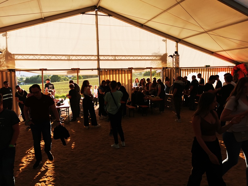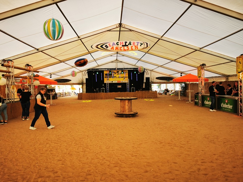 Es sind nicht nur die 50 Tonnen Sand, die man unter den Füßen spürt, sondern auch die Liebe zum Detail, die Schlauchboote, ein Segelboot, Strandkörbe und vieles mehr, die die Beachparty zu einem einmaligen Event in der Region werden lässt. Nach dem Motto "The same procedure as eyery year" startete der legendäre "DJ Tanzbär" mit dem Abba Song "Chiquitita" pünktlich um 20:00 Uhr die "Beachparty Vol. 4". Während des Songs bildeten alle Helfer der Beachparty, einheit- lich gekleidet mit schwarzem Oberteil und Hawaii-Kette, auf dem riesigen Zeltareal einen Kreis und stimmten so auf die Beachparty ein.