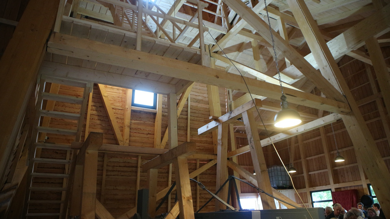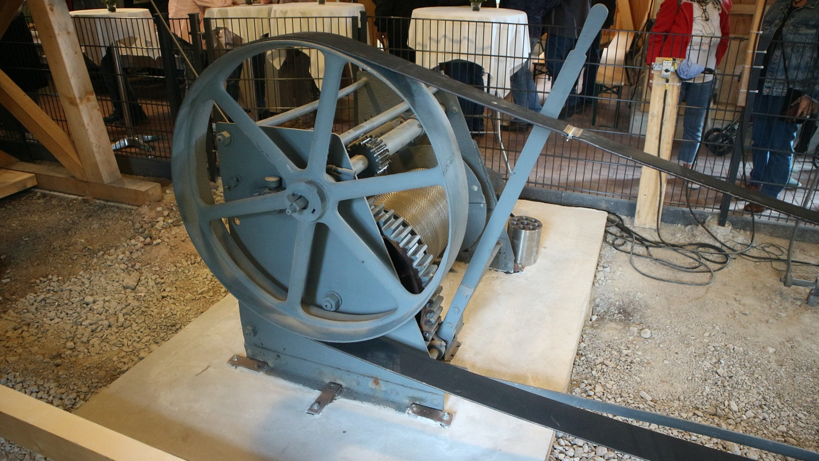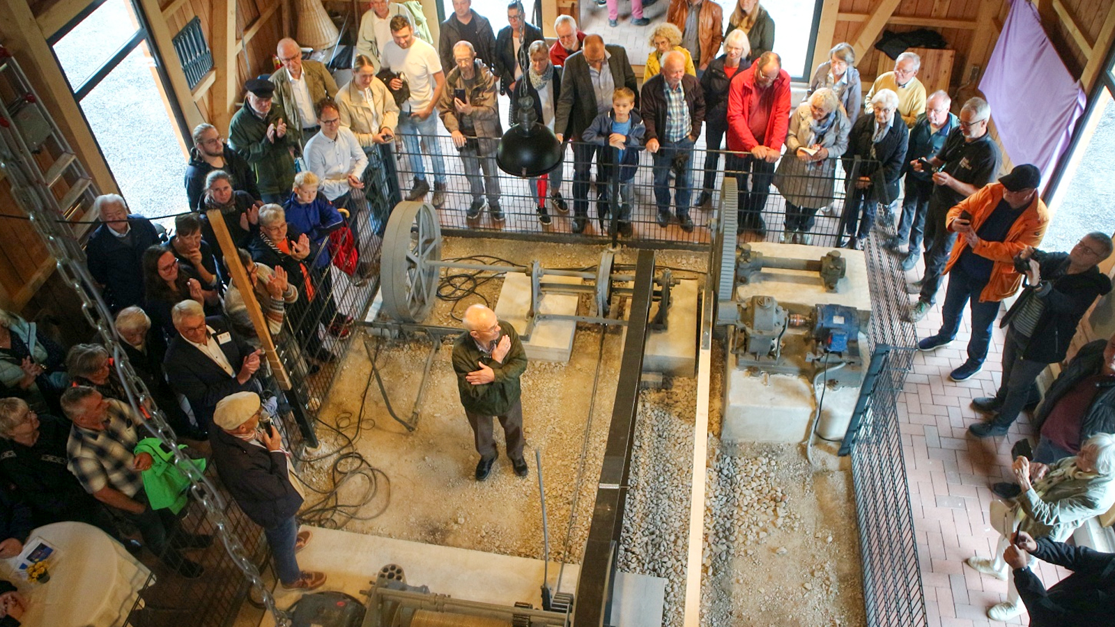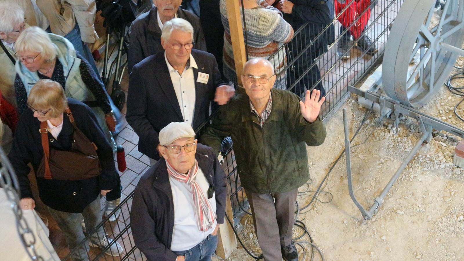 Zum Abschluss durfte Ewald Merk, der in wenigen Tagen seinen 90. Geburtstag feiert, im hölzernen Salinenturm unter großem Applaus den Schalter für die restaurierte Pumpwippe betätigen.