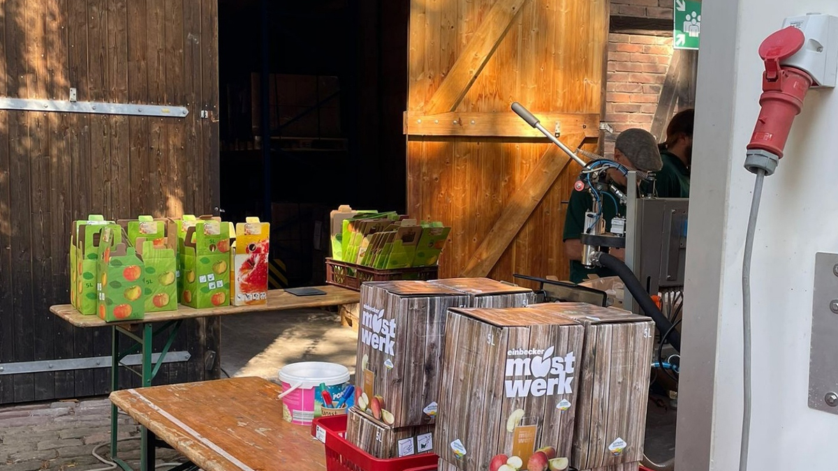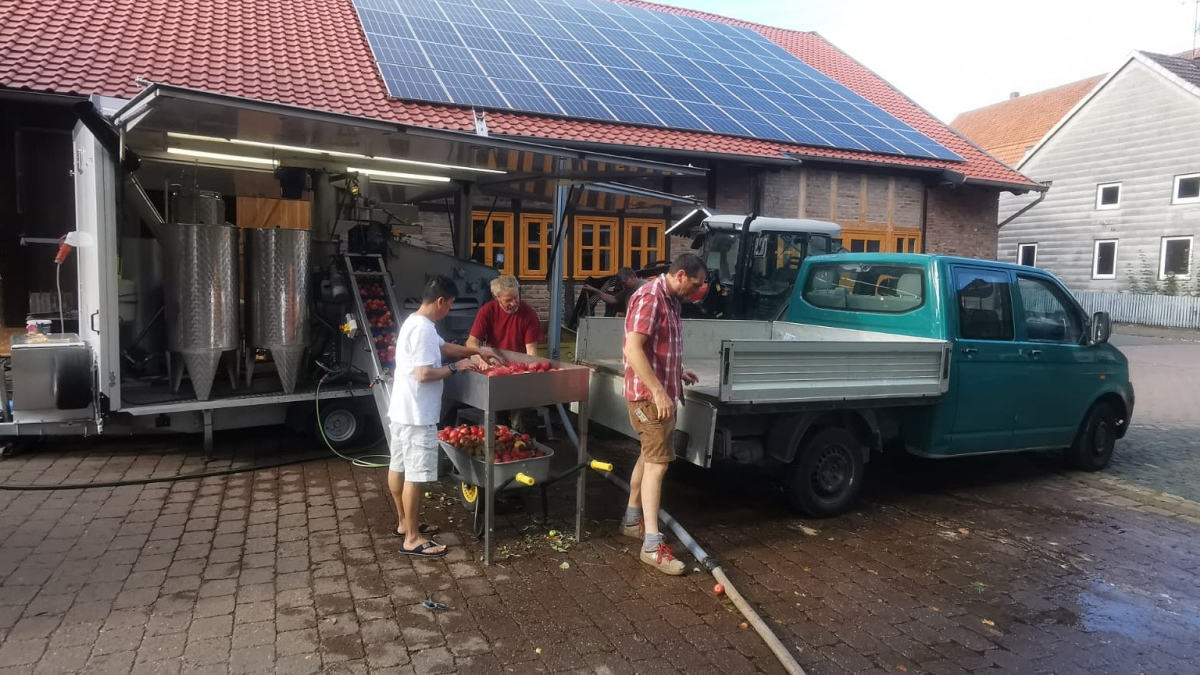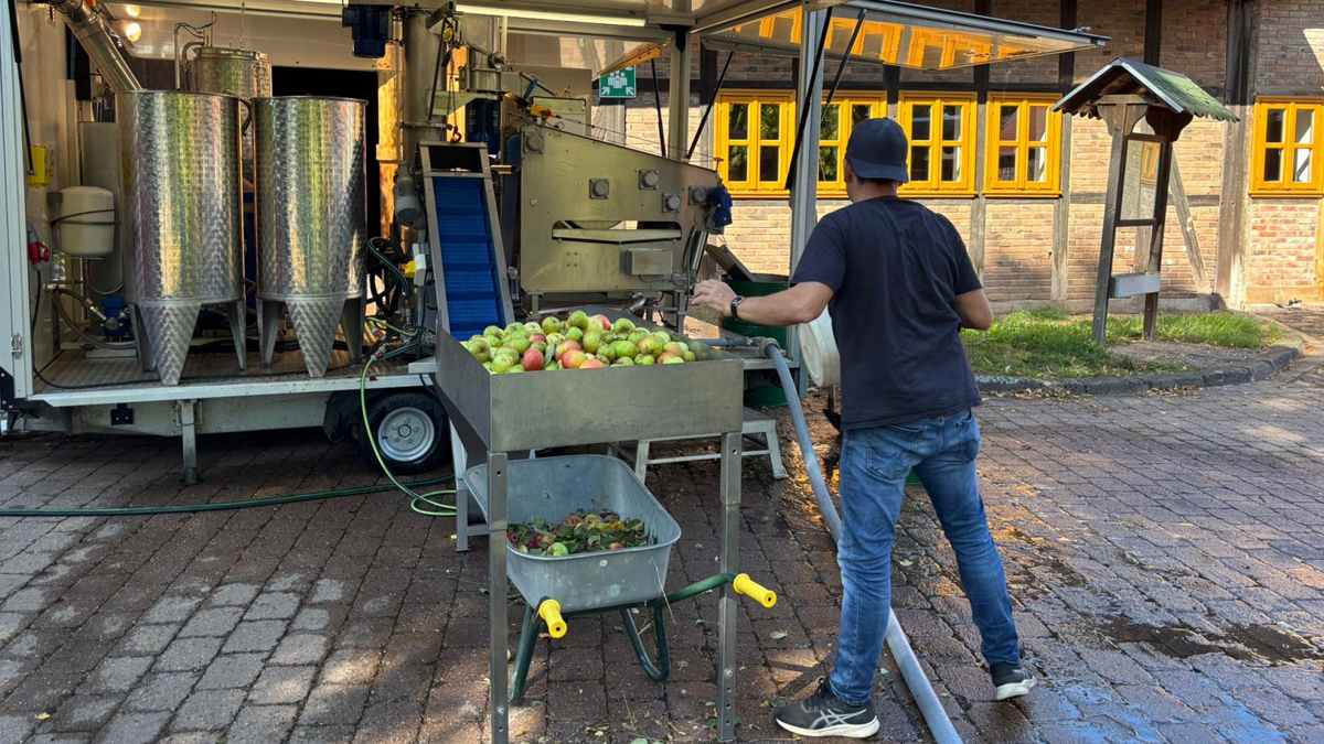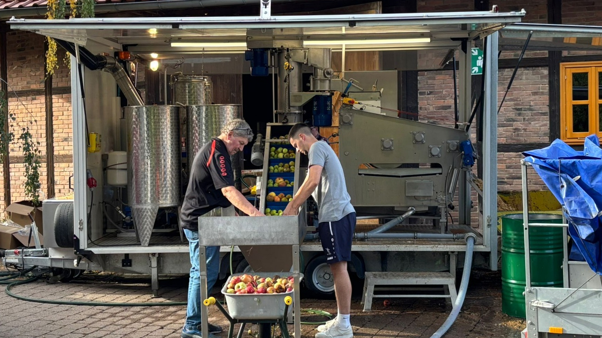 Amelsen (gs). Am 19. September 2025 verwandelte sich der Amelser Dorfplatz in eine kleine Mosterei. Der Förderverein Amelsen hatte das mobile Mostwerk aus Einbeck eingeladen – mit großem Erfolg: Insgesamt wurden 1.680 Kilogramm Äpfel zu frischem Saft verarbeitet. Zahlreiche Dorfbewohner brachten ihre eigene Ernte mit und ließen sie direkt vor Ort abfüllen.