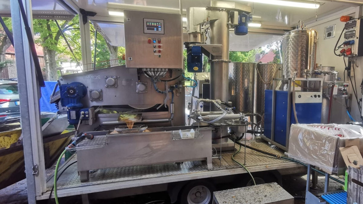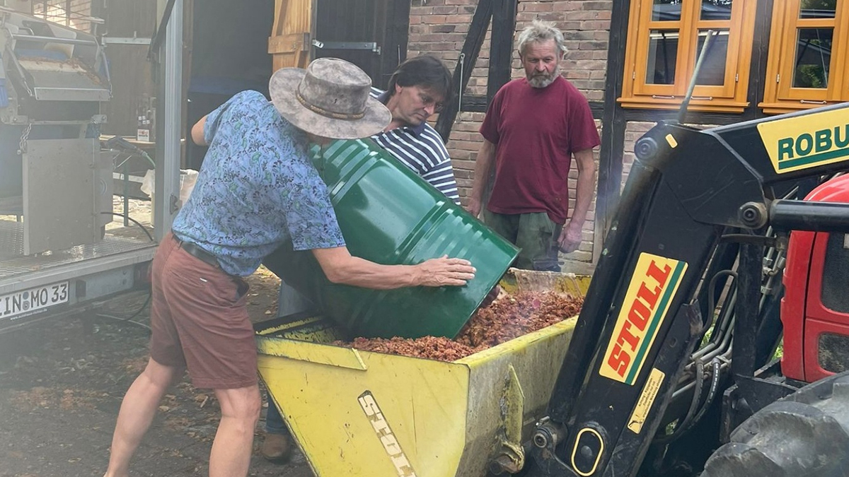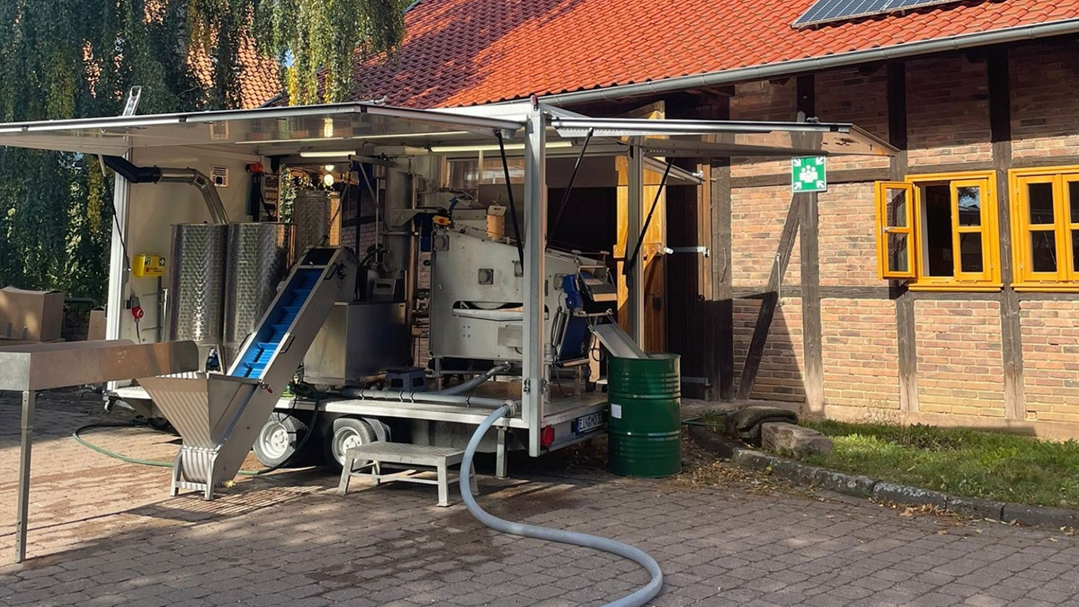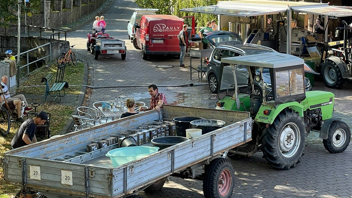 Amelsen (gs). Am 19. September 2025 verwandelte sich der Amelser Dorfplatz in eine kleine Mosterei. Der Förderverein Amelsen hatte das mobile Mostwerk aus Einbeck eingeladen – mit großem Erfolg: Insgesamt wurden 1.680 Kilogramm Äpfel zu frischem Saft verarbeitet. Zahlreiche Dorfbewohner brachten ihre eigene Ernte mit und ließen sie direkt vor Ort abfüllen.