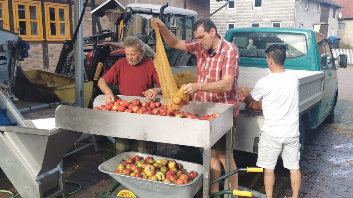 Andere nutzten die Gelegenheit, den Prozess vom Waschen und Zerkleinern der Äpfel bis hin zum Abfüllen in 3-, 5- oder 10-Liter-Beutel live mitzuerleben. Für das leibliche Wohl sorgten Kaffee, Kuchen und Getränke. So wurde die Aktion nicht nur zu einer Möglichkeit der Saftproduktion, sondern auch zu einem geselligen Dorftreffen.