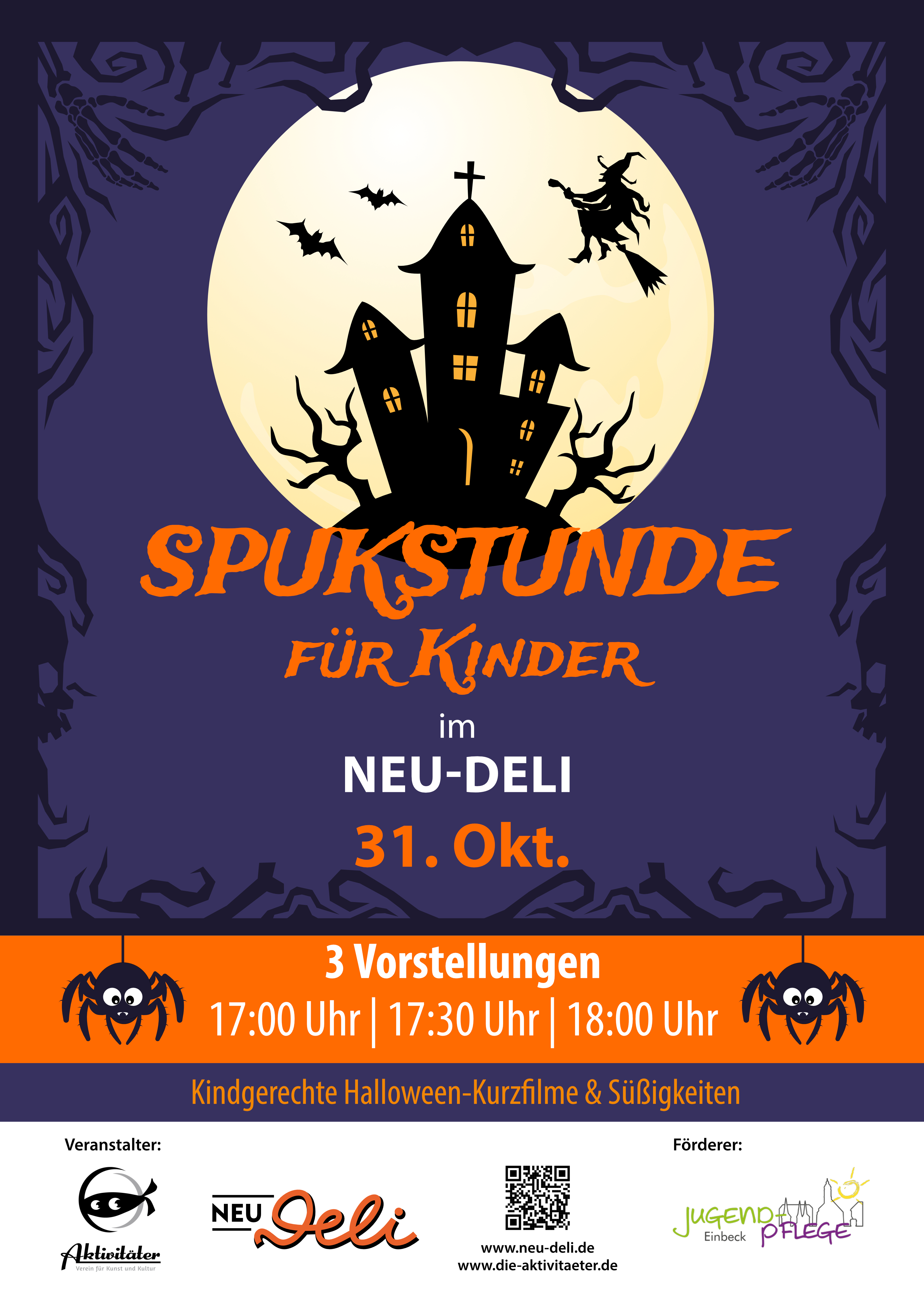 Egal ob Kind, Mumie, Vampirprinzessin oder Spiderman – alle sind eingeladen, am 31. Oktober in das NEU-Deli, Münsterstraße 12a, zu kommen und sich „gespenstisch“ gut unterhalten zu lassen. Der Kulturverein Aktivitäter e. V. präsentiert in Kooperation mit den Einbecker Lichtspielfreunden e. V. und mit Unterstützung der Stadtjugendpflege drei separate Kurzfilmvorstellungen um 17 Uhr, 17.30 Uhr und 18 Uhr.