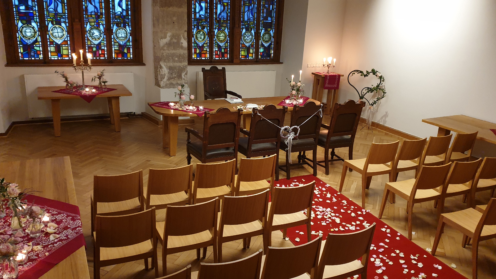 Der festlich geschmückte Trausaal erstrahlt an diesem Abend im warmen Licht unzähliger Kerzen. Auf einem roten Teppich, bereitgestellt von Taxi Konstantin, schreiten die Paare zur Trauung. Nach dem Ja-Wort genießen die frisch Vermählten und ihre Gäste Live-Musik von Tatjana und Marcus sowie kostenfreie Getränke in der stimmungsvoll beleuchteten Rathaushalle.