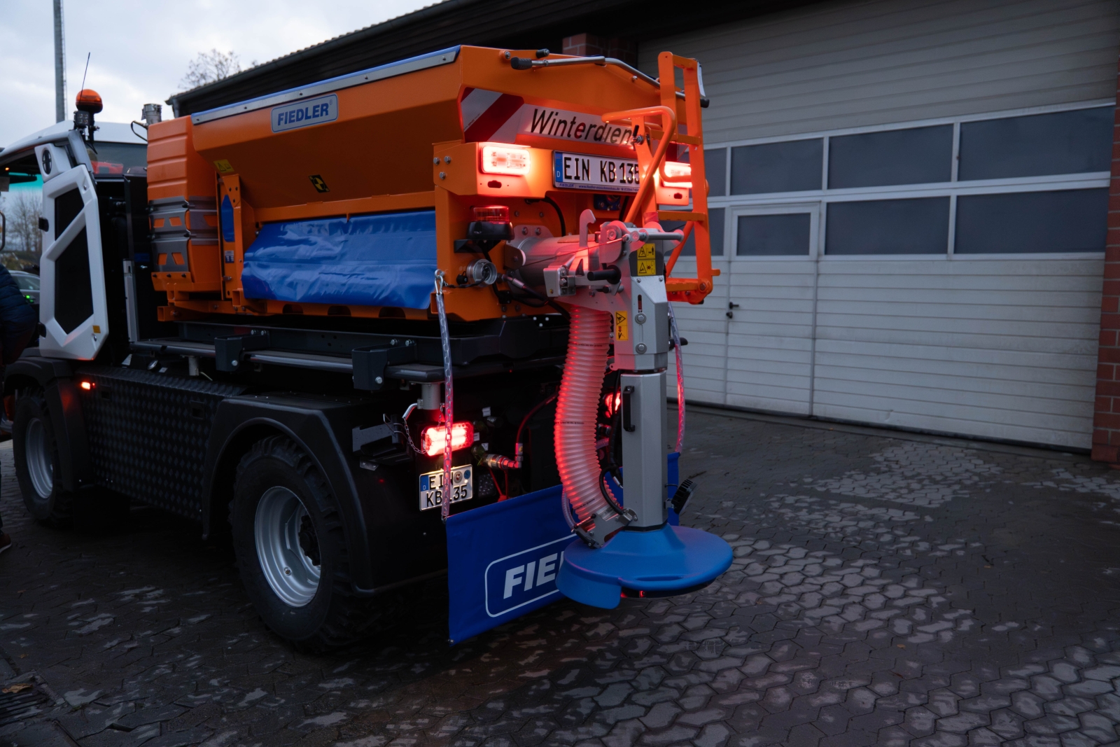 Zum Lieferumfang gehören neben dem Trägerfahrzeug auch mehrere Anbaugeräte der Firma Fiedler: ein Feuchtsalzstreuautomat, ein Keilräumflug und eine Frontanbaukehrmaschine. Die Kombination dieser Komponenten ermöglicht einen flexiblen Ganzjahreseinsatz – etwa beim Räumen, Kehren oder Pflegen öffentlicher Flächen. Der neue Streuautomat mit einem Fassungsvermögen von 1,2 Kubikmetern Salz und 600 Litern Sole entspricht dem neuesten Stand der Technik.