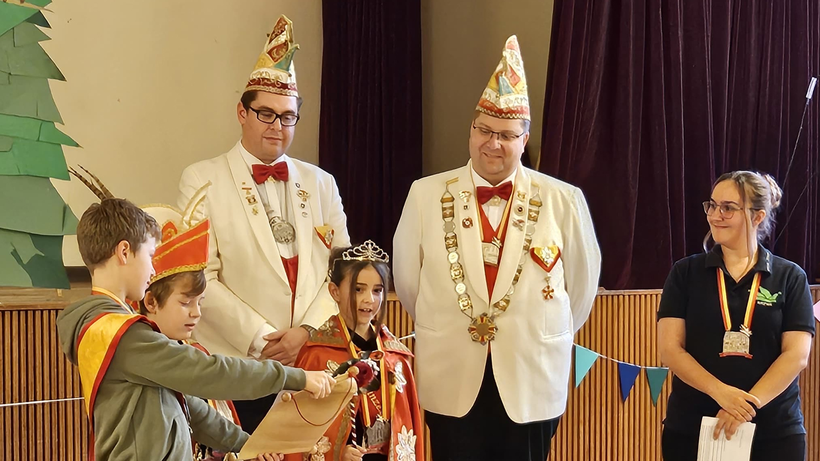 Feierlich wurden Liah I. und Anton I. in ihr Amt eingeführt und als neues Kinderprinzenpaar der Narrenjugend inthronisiert. Das bisherige Prinzenpaar Marlena und Michel erhielt für sein Engagement großen Applaus – die beiden begleiten die neuen Regenten künftig als Adjutanten. Zur Ehre des neuen Prinzenpaars folgten eine Rede und ein Tanz von Kinder-Till Jamila, die mit Charme und Witz das Publikum begeisterte.