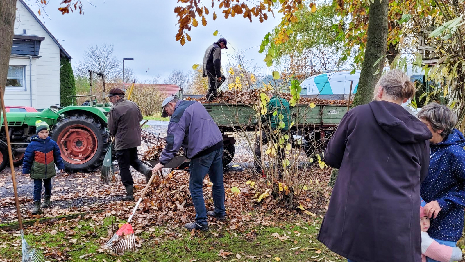 Eilensen (red). Pünktlich zur Herbstlaubaktion von Dorfgemeinschaft, Feuerwehr und Ortsrat am Samstag, 15. November 2025 hatten die Bäume noch einmal kräftig Laub abgeworfen. Mit den notwendigen Gerätschaften trafen sich die Helferinnen und Helfer auf den „Thie“. Bereits seit Anfang Oktober war das Laub vom Thieplatz und der Fläche vor der St.-Anna-Kapelle regelmäßig mit dem Rasentraktor aufgenommen und rund um die Baumscheiben gelagert worden. Dadurch verringerte sich die Menge erheblich, sodass lediglich zwei Gummiwagen abtransportiert werden mussten.