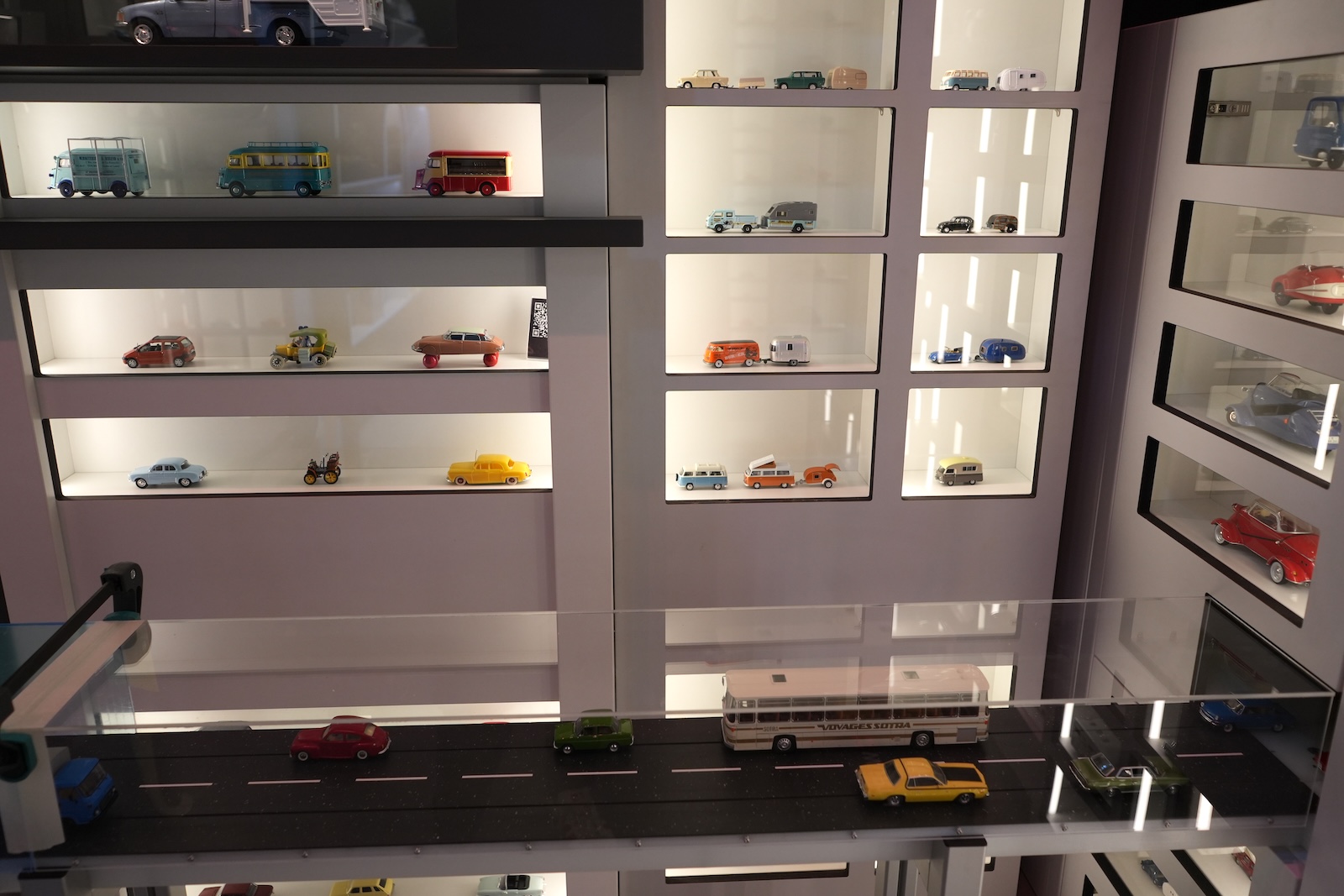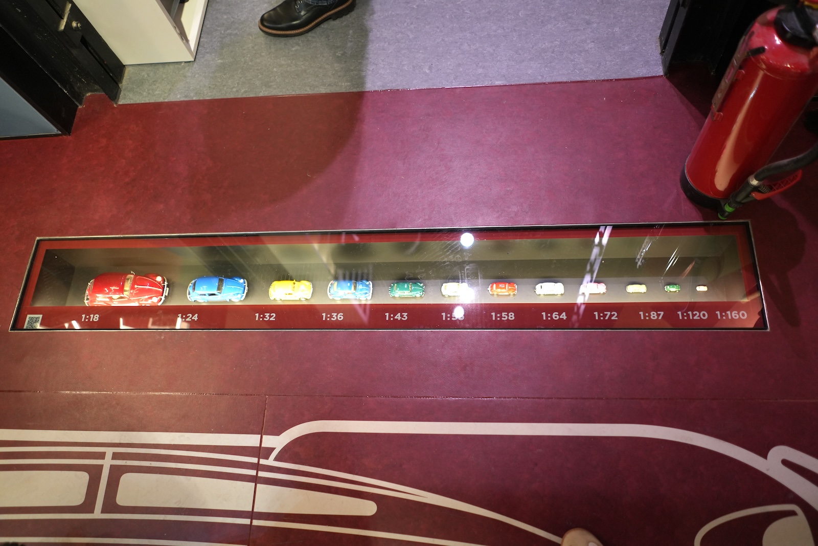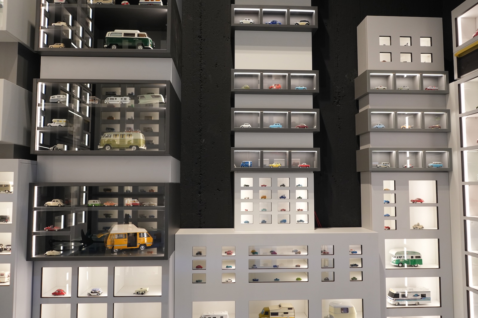 Die Präsentation folgt einem abwechslungsreichen Konzept, das Wissen, Erlebnis und Interaktion verbindet. Ein einführender Text sowie vier Überblicksthemen – Maßstab, Diorama, Modellfahrzeugmarkt und die Frage „Wer sammelt eigentlich?“ – geben Orientierung. Über QR-Codes stehen digitale Zusatzinhalte bereit, und ein fünf Meter hoher Sammlungsturm ermöglicht es, ausgewählte Exponate per Bildschirm genauer zu erkunden. Ein begehbares Diorama sowie ein Autoquartett laden zu spielerischen Momenten ein. Der Rundgang führt vom Vergleich verschiedener Maßstäbe – anschaulich dargestellt am legendären VW Käfer – über eine urban inszenierte Kulisse mit Dioramen bis hin zu einem Paternoster, der Modelle verschiedenster Art in Bewegung zeigt. Im Abschlussraum „Mein Modell“ rücken acht wechselnde Lieblingsstücke in den Mittelpunkt, jeweils verbunden mit persönlichen Geschichten ihrer Besitzerinnen und Besitzer.