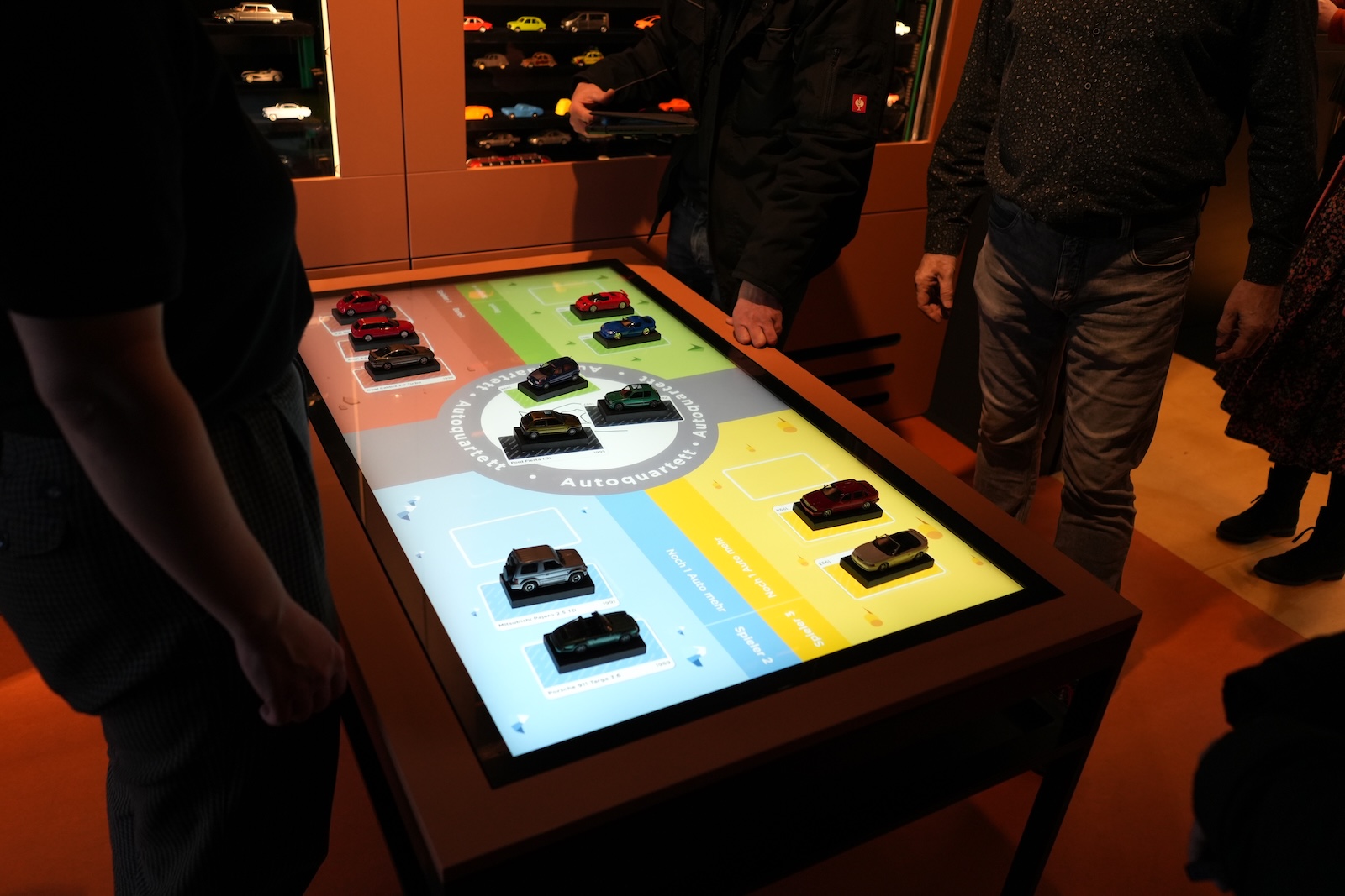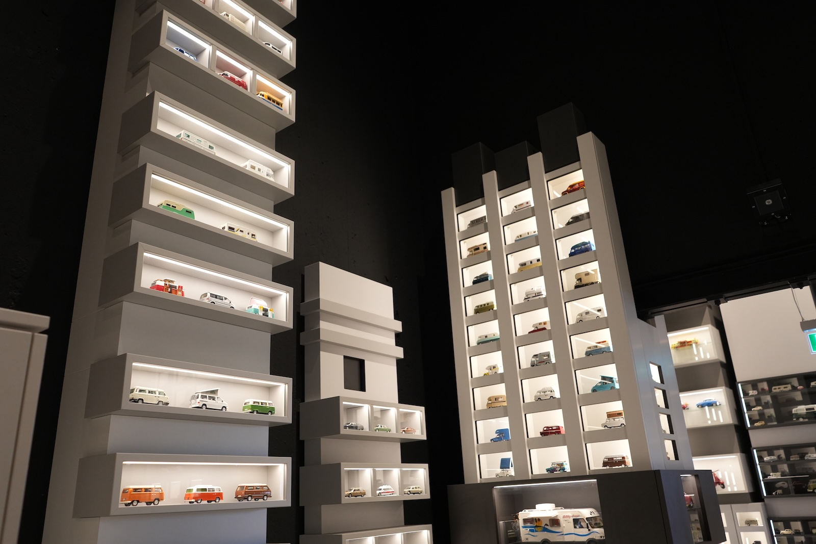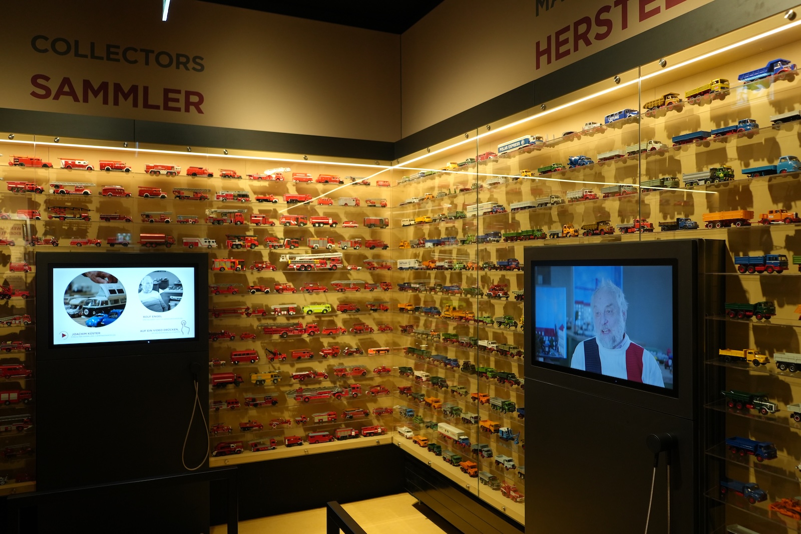 Die Präsentation folgt einem abwechslungsreichen Konzept, das Wissen, Erlebnis und Interaktion verbindet. Ein einführender Text sowie vier Überblicksthemen – Maßstab, Diorama, Modellfahrzeugmarkt und die Frage „Wer sammelt eigentlich?“ – geben Orientierung. Über QR-Codes stehen digitale Zusatzinhalte bereit, und ein fünf Meter hoher Sammlungsturm ermöglicht es, ausgewählte Exponate per Bildschirm genauer zu erkunden. Ein begehbares Diorama sowie ein Autoquartett laden zu spielerischen Momenten ein. Der Rundgang führt vom Vergleich verschiedener Maßstäbe – anschaulich dargestellt am legendären VW Käfer – über eine urban inszenierte Kulisse mit Dioramen bis hin zu einem Paternoster, der Modelle verschiedenster Art in Bewegung zeigt. Im Abschlussraum „Mein Modell“ rücken acht wechselnde Lieblingsstücke in den Mittelpunkt, jeweils verbunden mit persönlichen Geschichten ihrer Besitzerinnen und Besitzer.