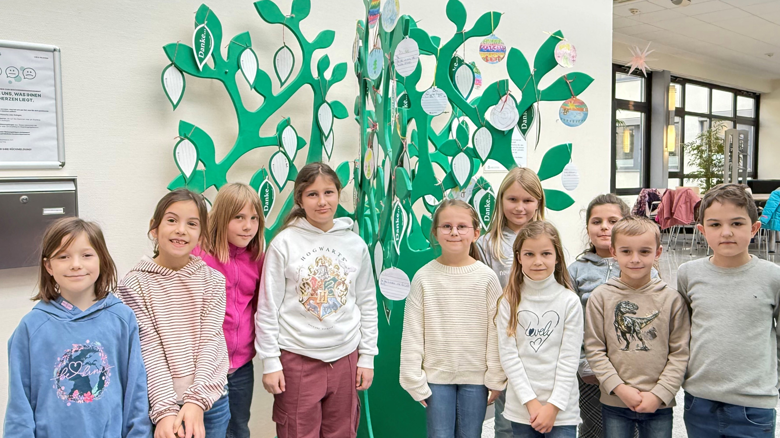 Nun erstrahlt der Danke-Baum im „Weihnachtsglanz“: Zur Adventszeit brachten die Schülerinnen und Schüler freudestrahlend ihre bunten Dankesbotschaften in Form von Weihnachtskugeln zu einem Treffen in der Asklepios Harzklinik Goslar mit. Damit möchten sie sich bei den Mitarbeitenden für ihre Arbeit über das gesamte Jahr hinweg bedanken. Die zweite Klasse der Worthschule hatte sich zuvor im Unterricht intensiv mit dem Thema „Dankbarkeit“ beschäftigt und ganz persönliche Festtagsbotschaften gestaltet.