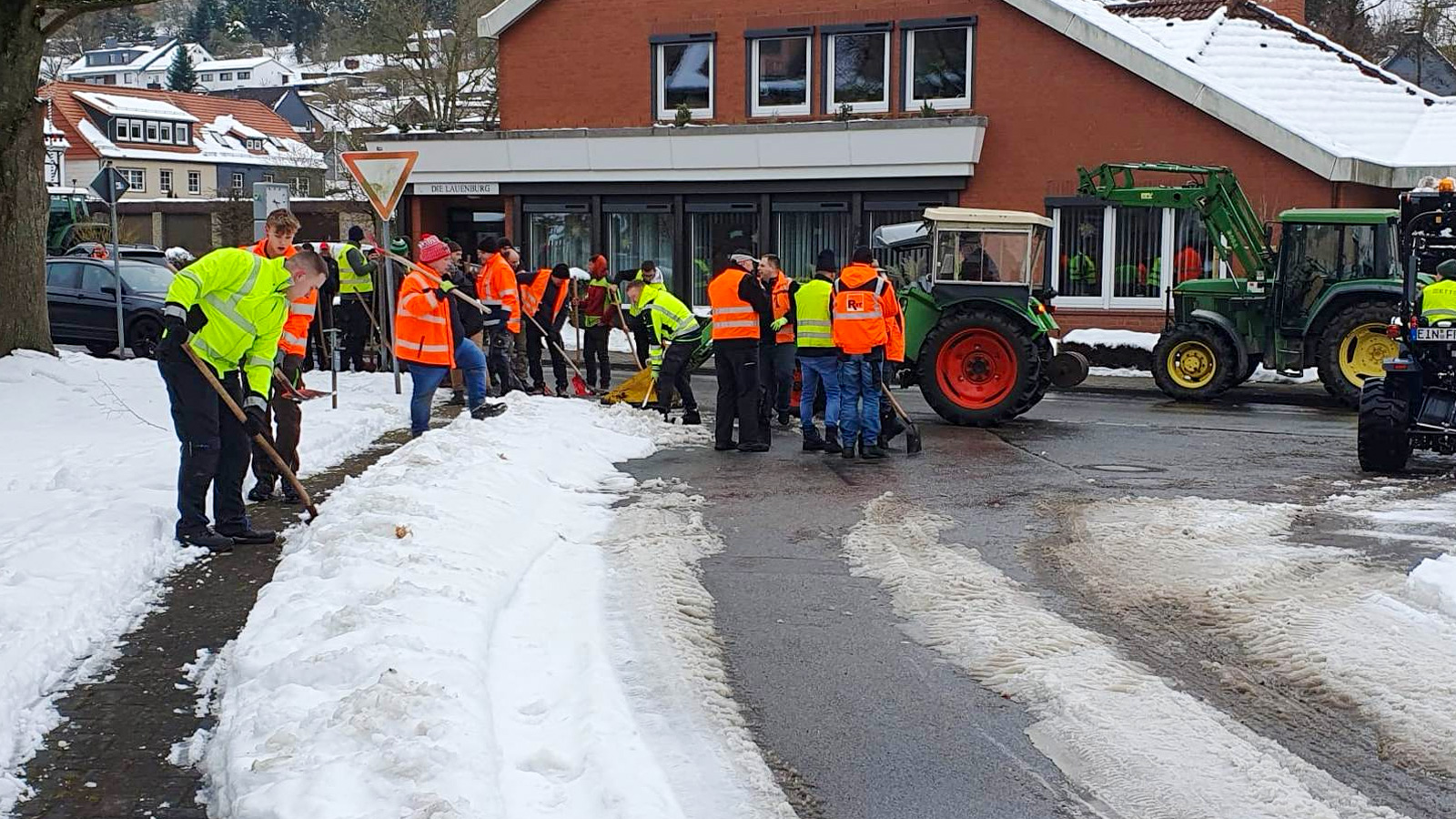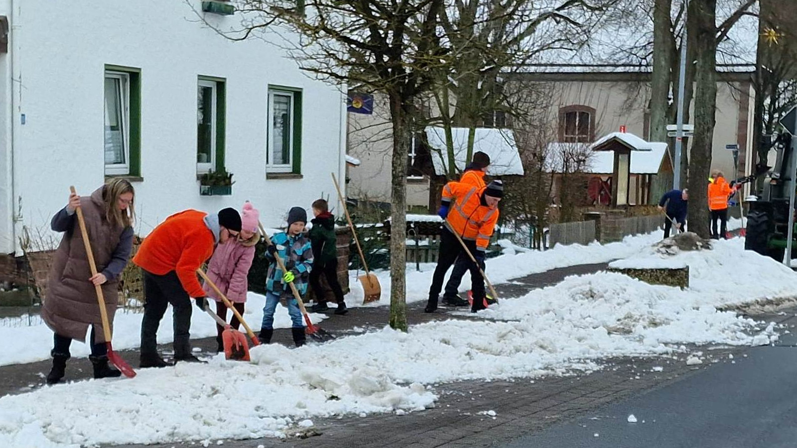 In der Spitze beteiligten sich mehr als 100 Helferinnen und Helfer an der Aktion. Bereits nach rund drei Stunden sei das gesetzte Ziel deutlich übertroffen worden. Neben reiner Muskelkraft kamen auch verschiedene Fahrzeuge zum Einsatz, um Schnee und Eis zügig aus dem Ort zu schaffen. Ein mobiler Versorgungstrupp sorgte zwischendurch mit Kaffee und Kuchen für Stärkung direkt an der Straße.