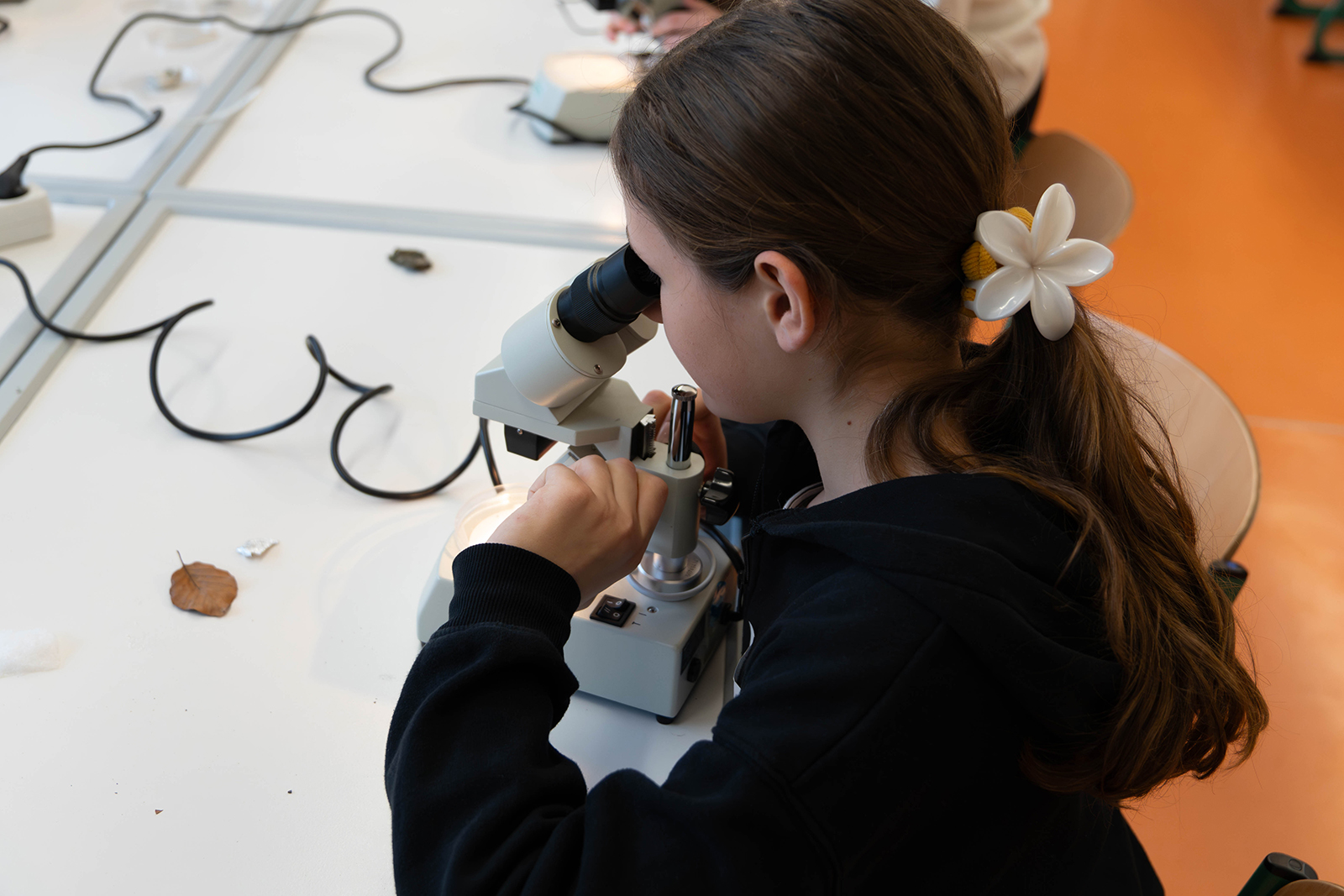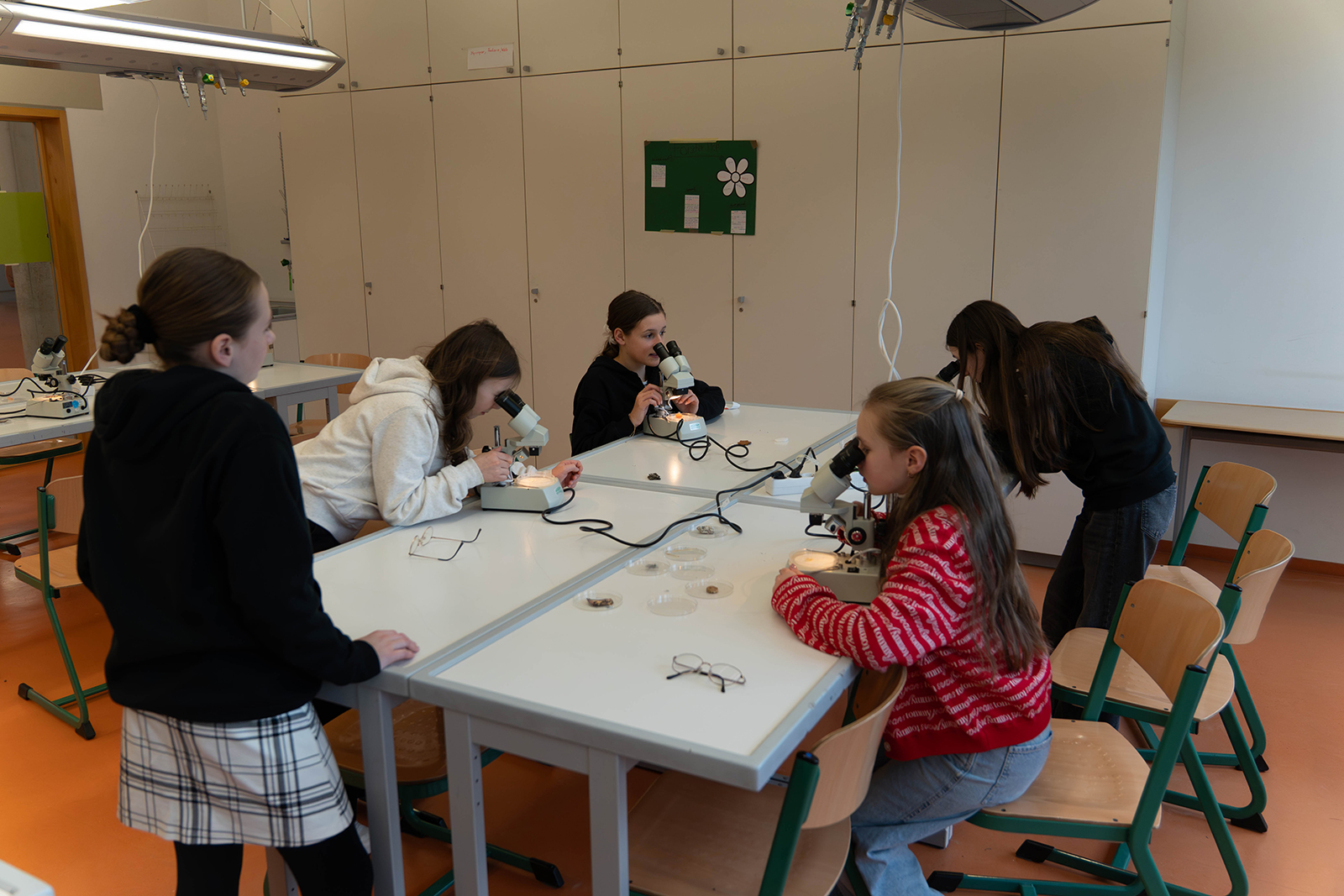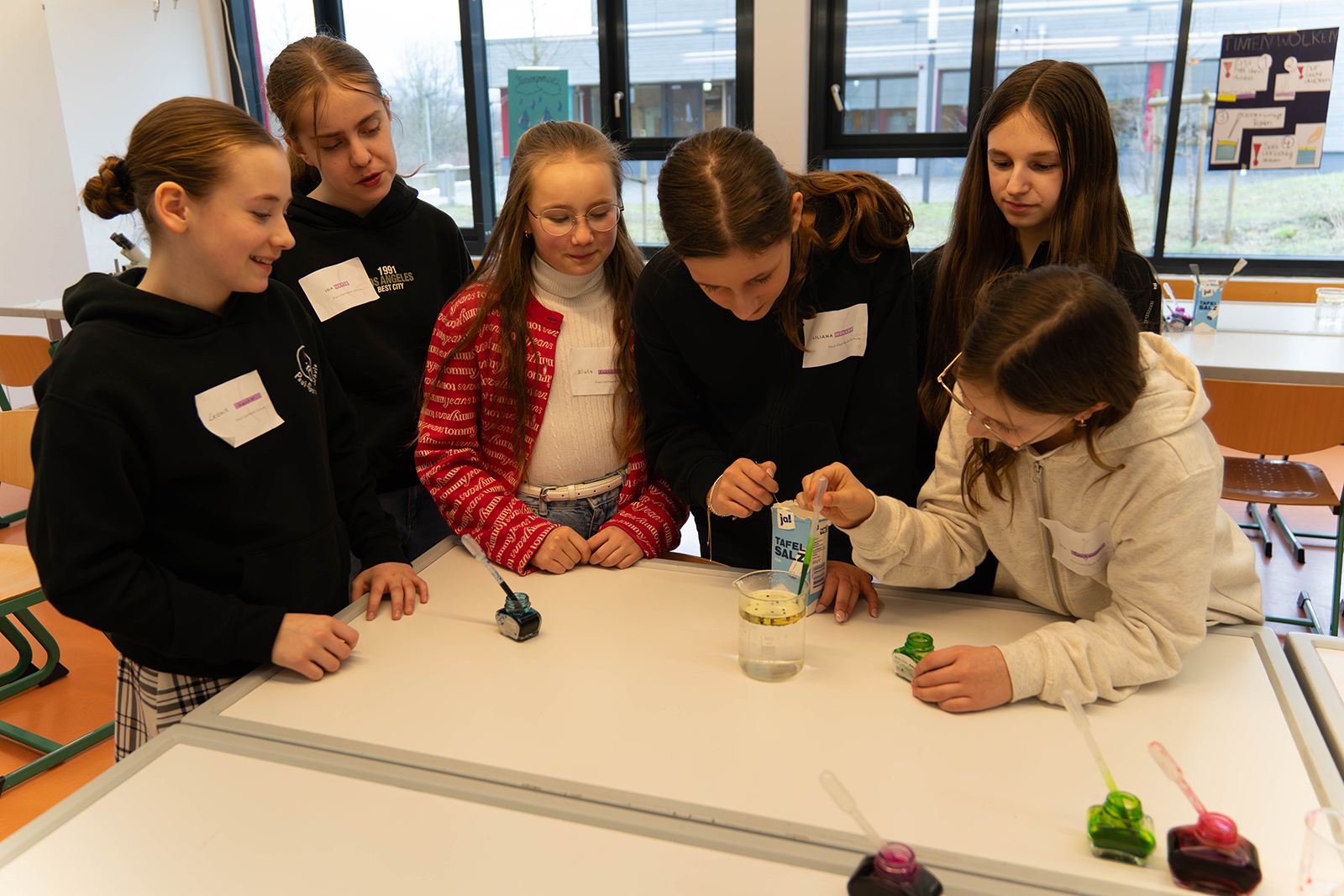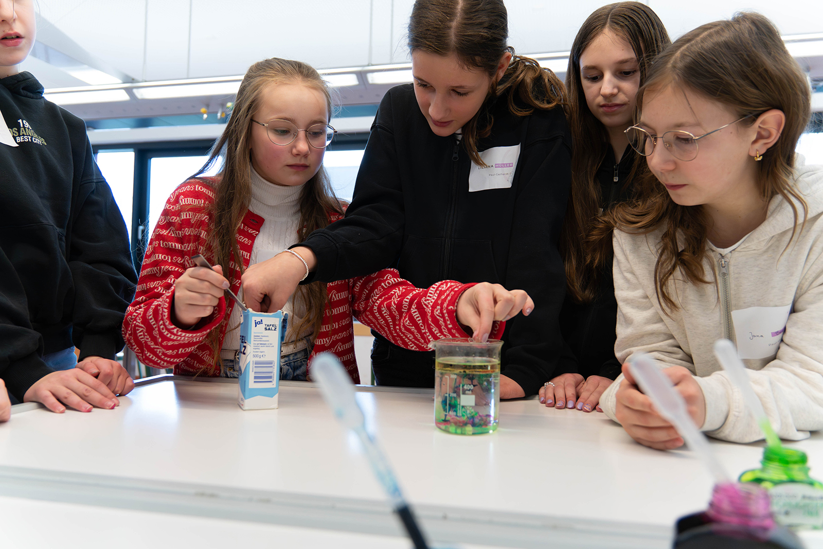Im naturwissenschaftlichen Bereich standen mehrere Experimentierstationen bereit. Unter Anleitung durften die Kinder Proben unter dem Mikroskop betrachten und Details erkennen, die mit bloßem Auge verborgen bleiben. Daneben wurden Versuche rund um physikalische und chemische Phänomene angeboten. Besonders anschaulich zeigte sich ein Experiment, bei dem sich Farbspiele in einem Wasserglas entfalteten und Reaktionen sichtbar machten. Die Stationen waren so aufgebaut, dass die Kinder nicht nur zuschauten, sondern eigenständig ausprobierten, beobachteten und Fragen stellten.