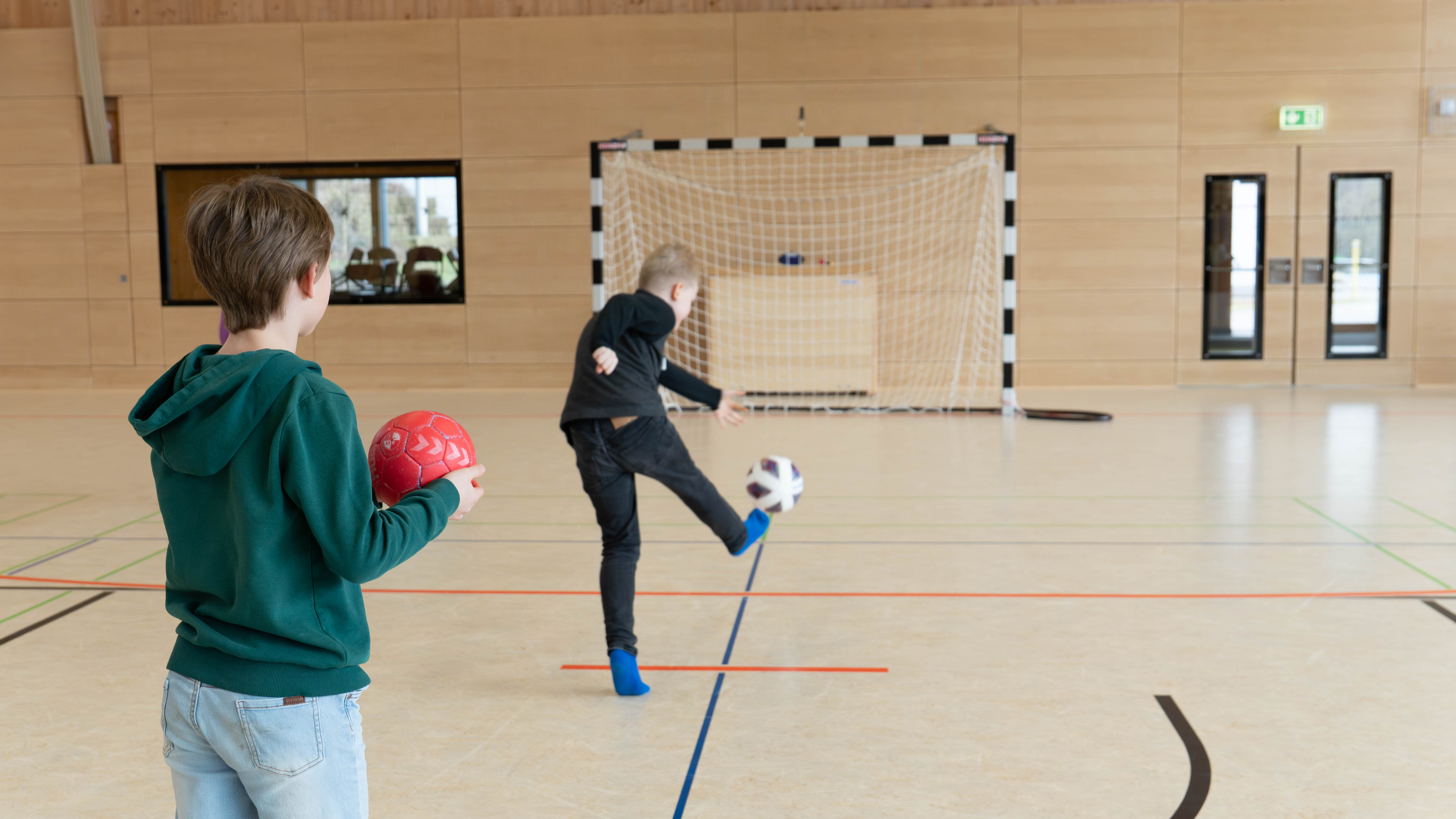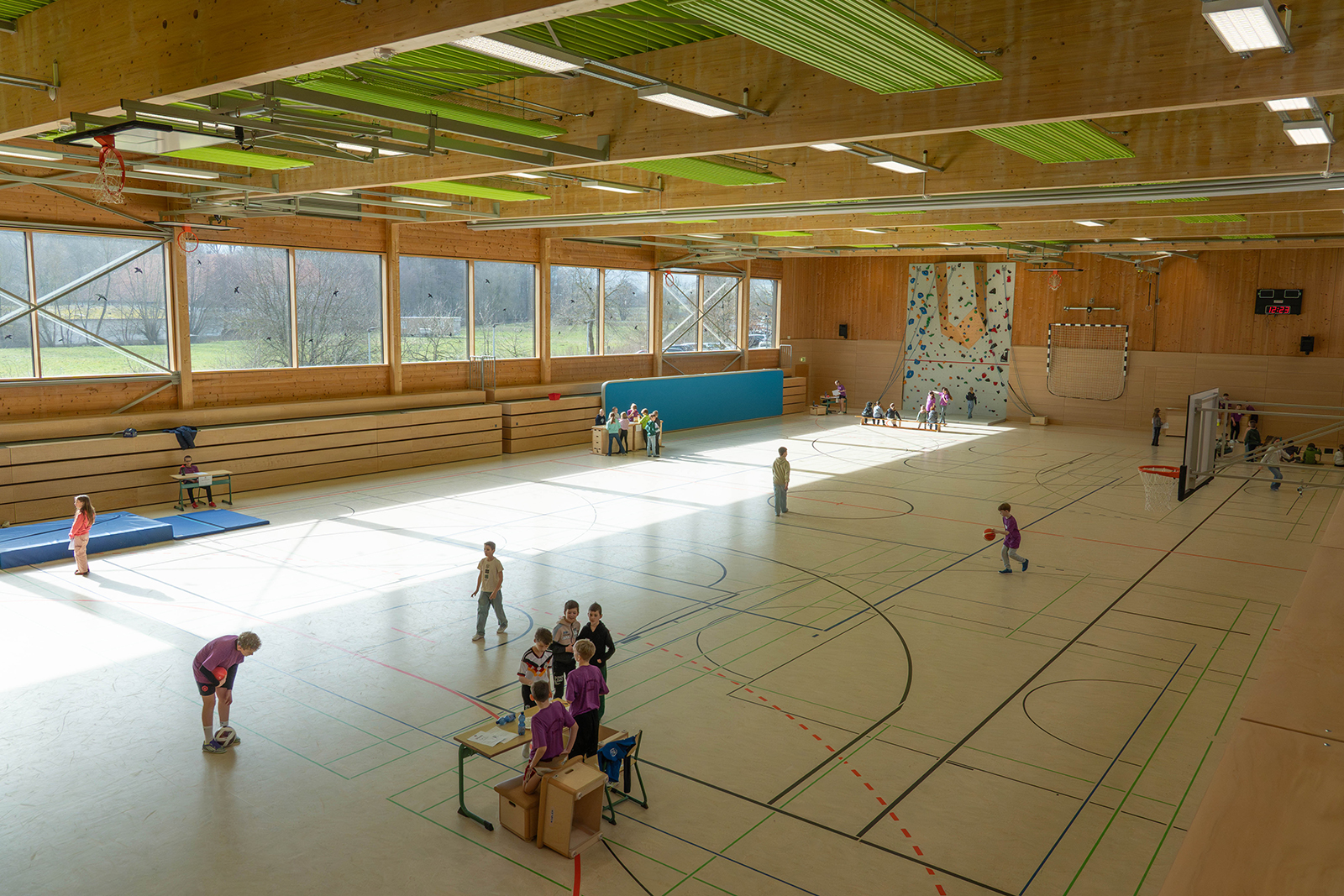 Bewegung prägte das Bild in der großen Sporthalle. Dort war eine Sprungschanze aus Bänken aufgebaut, auf der ein Skisprung nachempfunden werden konnte. An der schuleigenen Kletterwand wagten sich viele Kinder an erste Boulderübungen. Weitere Stationen luden dazu ein, die eigene Wurf- oder Schussgeschwindigkeit zu messen und mit anderen zu vergleichen. Digitale Quizformate sorgten zusätzlich für Abwechslung, etwa mit Fragen zu Sportarten oder zur Zusammensetzung von Lebensmitteln. Bei einem Ernährungsquiz mussten Zuckerwürfel den passenden Produkten zugeordnet werden, um ein Gefühl für versteckte Zuckermengen zu entwickeln.