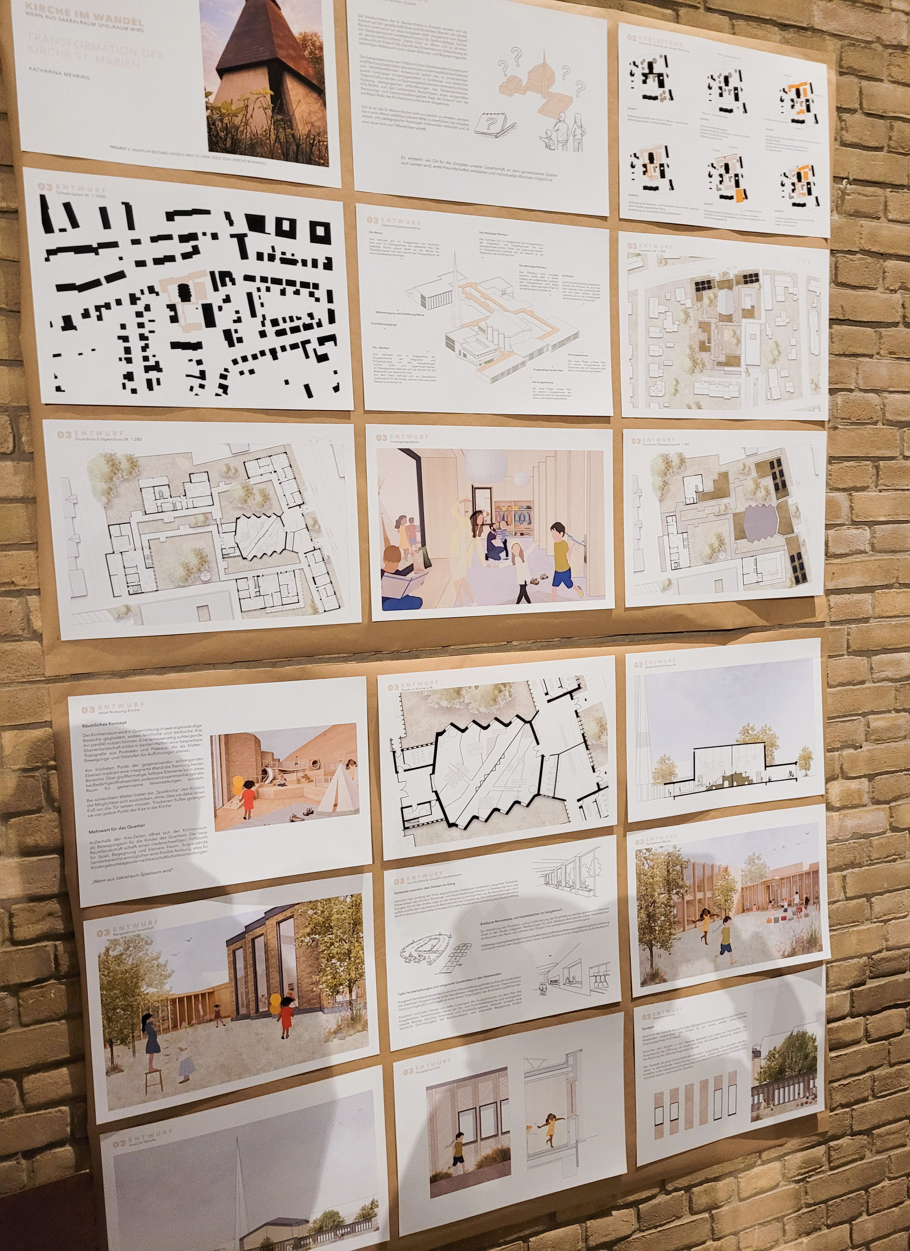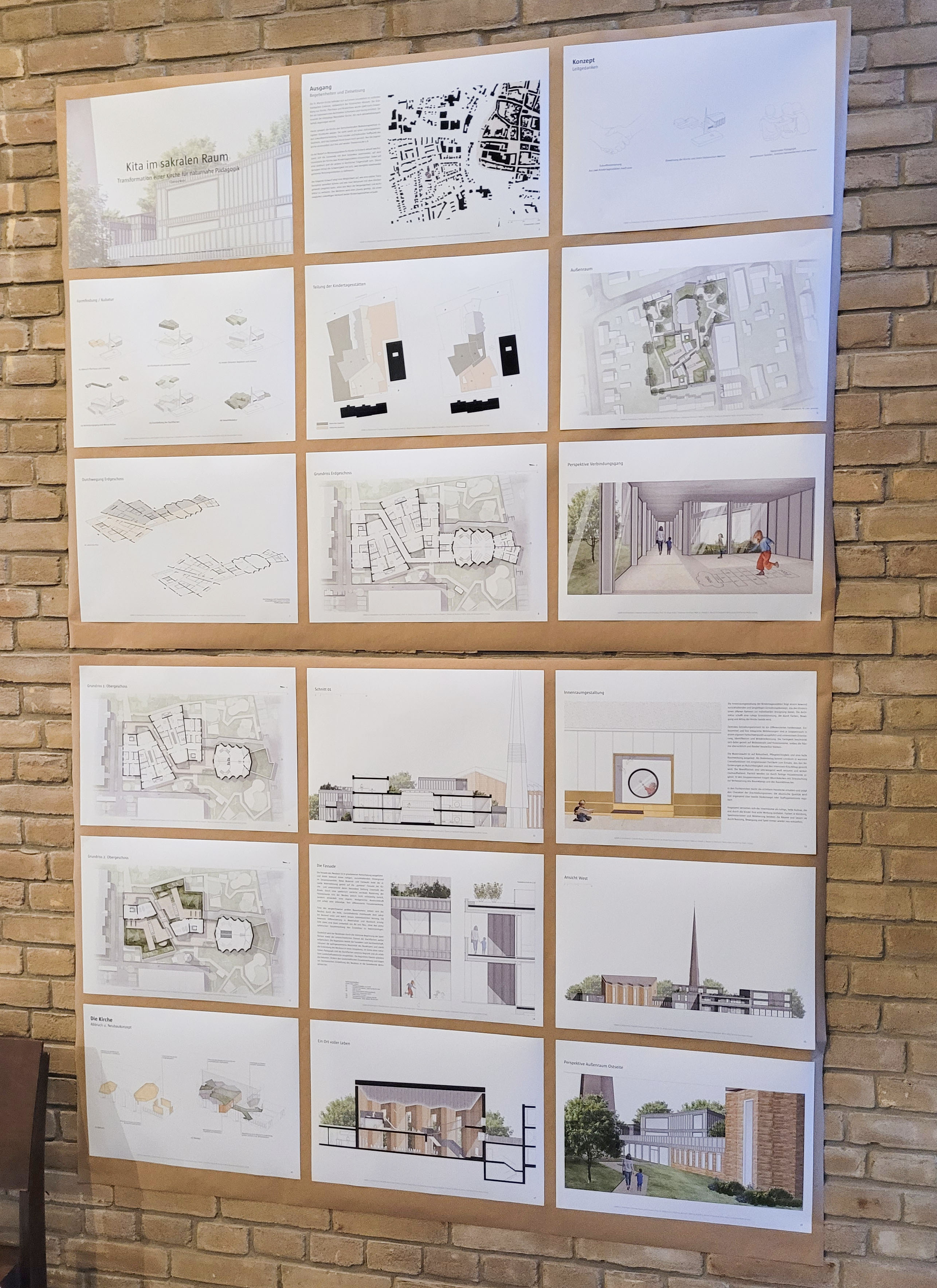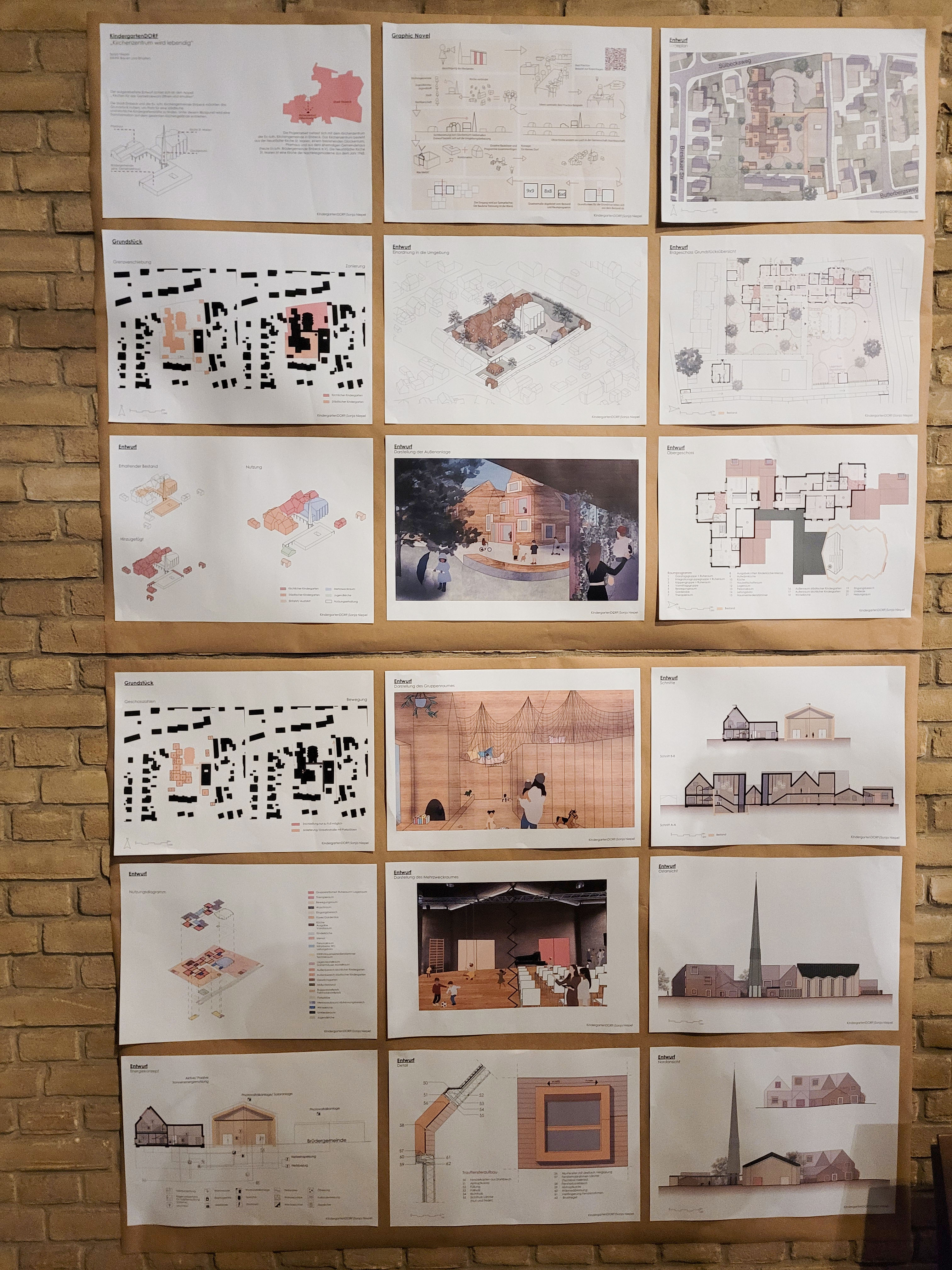 Ausgangspunkt für die studentischen Arbeiten war unter anderem die Frage, ob sich auf dem Gelände zwei Kindergärten – ein staatlicher und ein kirchlicher – realisieren ließen. Diese mögliche Nutzung bildete eine zentrale Grundlage mehrerer Entwürfe und stellte die Verbindung zwischen Kirchenareal und künftiger Bildungsinfrastruktur her.