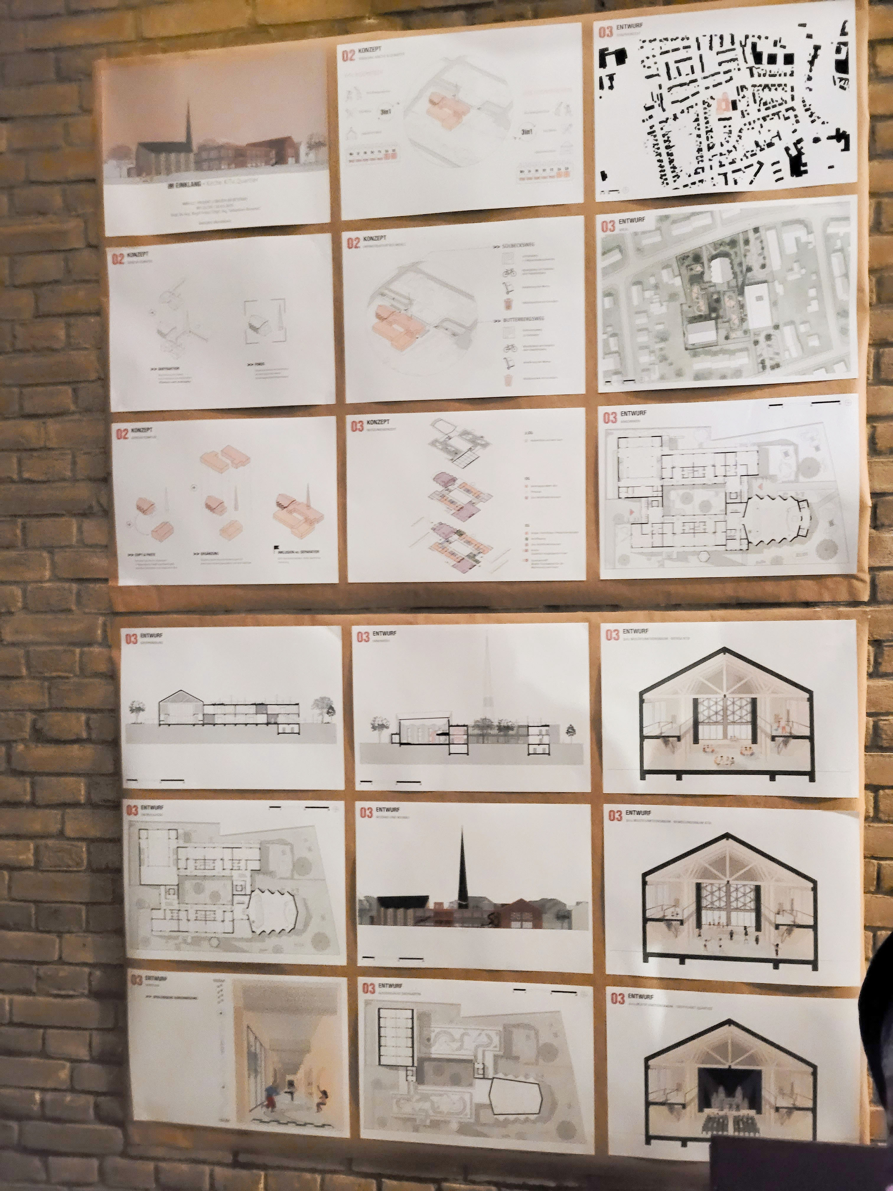 Die zwölf Konzepte wurden an den Kirchenwänden ausgehängt. Zehn davon wurden zusätzlich auf der Bühne mit Projektor vorgestellt, da sich zwei Studierende derzeit im Auslandsstudium befinden. Rund 80 Besucherinnen und Besucher verfolgten die etwa anderthalbstündige Präsentation, in der sehr unterschiedliche Ideen für die künftige Nutzung des Geländes veranschaulicht wurden.