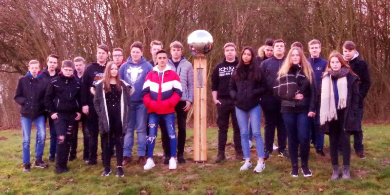 Das Profil Technik des Realschulzweiges hat sich viel vorgenommen. Ein erster Schritt ist nun gemacht. Im Werkraum der Schule entstand nach Schülerentwürfen aus dem Kunstunterricht der Prototyp einer Stele, auf der nun an der Einfahrt zum Schulgelände mit einer 40 Zentimeter großen Edelstahlkugel die Sonne symbolisiert wird. Alle Holzarbeiten und den Guss des Fundamentes übernahmen die Schülerinnen und Schüler selbst. Nur die Schweißarbeiten mussten außer Haus erledigt werden. Herr Durau von der Firma Lasertechnik Kreiensen führte diesen Part kostenfrei aus. Diese Firma erstellt auch die lasergravierten Informationstafeln. Zurzeit befindet sich an der „Sonne“ noch ein provisorisches Schild, daher kann auch der QR-Code noch nicht abgerufen werden.