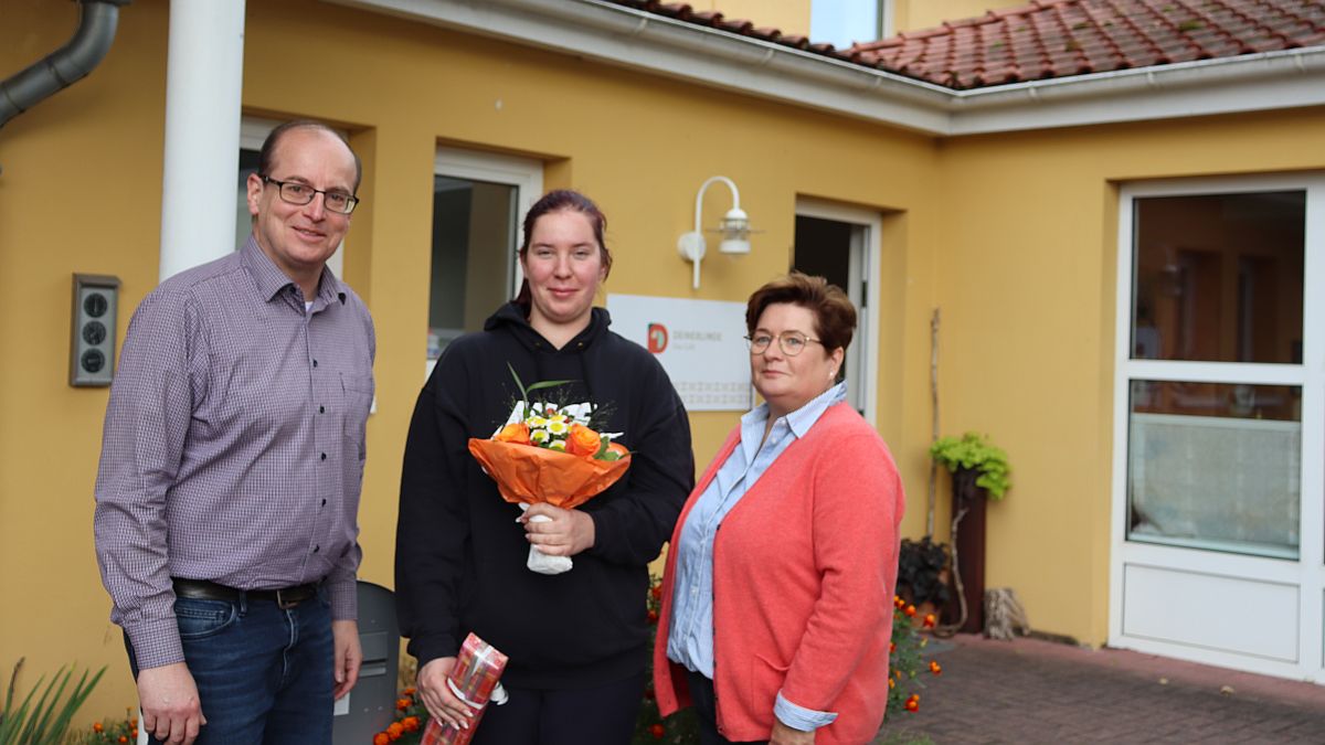 Doch nicht nur im Bereich der Pflege bildet die „Deinerlinde“ aus. Auch in der Hauswirtschaft absolvieren seit vielen Jahren junge Menschen ihre Berufsausbildung und erhalten dabei umfassende Einblicke in alle hauswirtschaftlichen Tätigkeiten, die in einer Seniorenpflegeeinrichtung anfallen. Marina Schmidt (23) schloss nun ebenfalls ihre dreijährige Ausbildung als Fachpraktikerin Hauswirtschaft ab und wurde zudem für das beste Berichtsheft ihres Ausbildungsjahrgangs ausgezeichnet. Mit ihr freuen sich Ausbilderin Elke Volger, Leitung Hauswirtschaft, sowie Einrichtungsleiter Alexander Kloss.