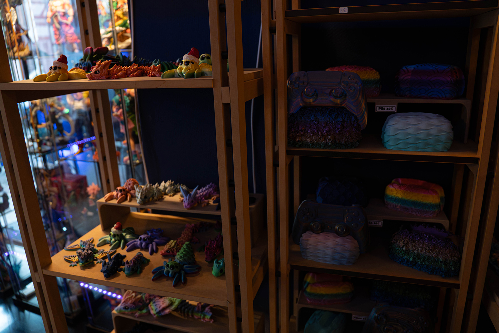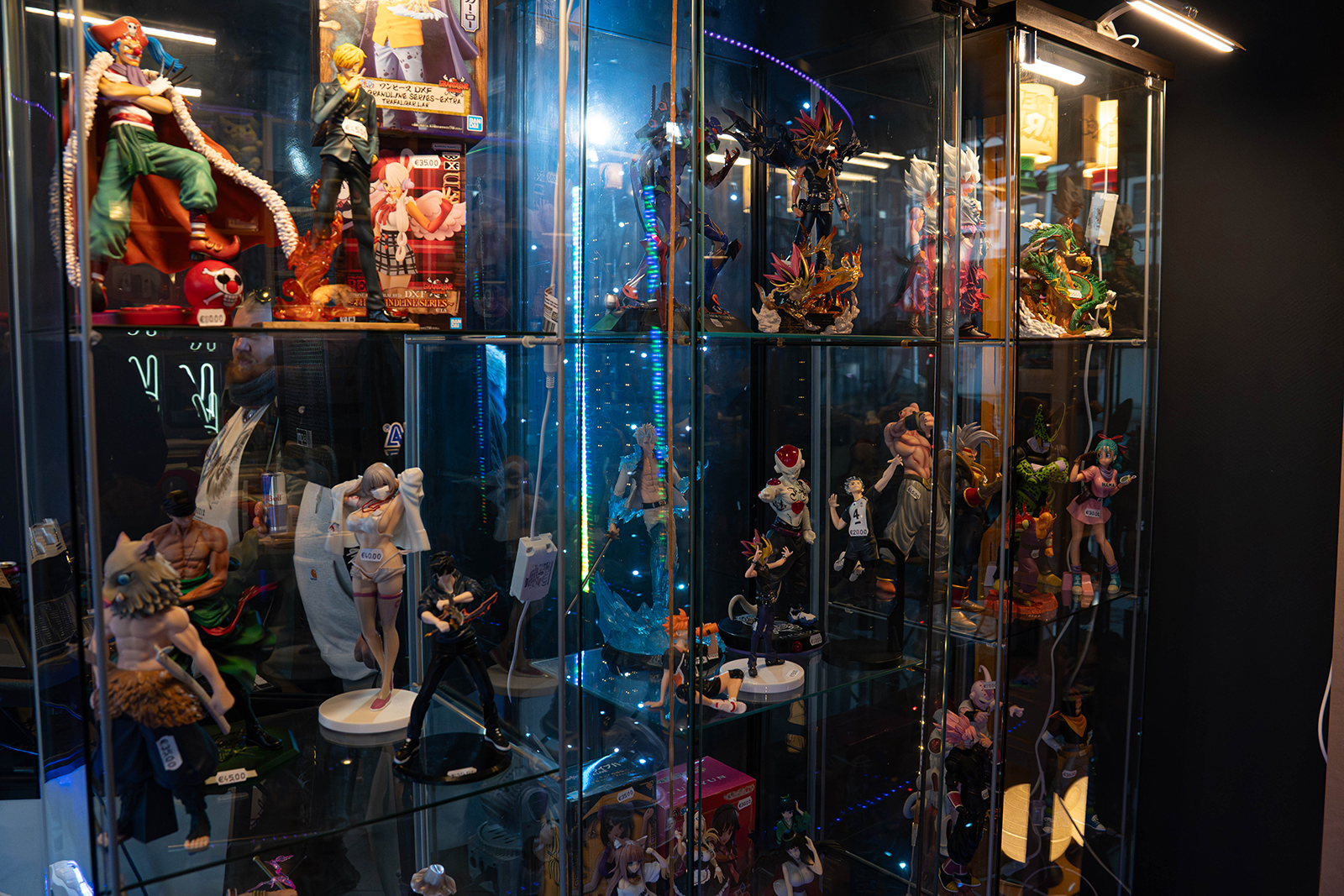 Parallel zum Spielbereich gibt es eine breite Palette an Artikeln rund um Gaming und Anime. Dazu gehören Merchandise-Produkte wie bedruckte Tassen und Holzbrettchen, Sammelfiguren, 3D-Druck-Modelle sowie Konsolen und Spiele für Systeme wie SNES, PlayStation, Xbox und mehr. Auch Reparaturen an Konsolen und Controllern werden angeboten.